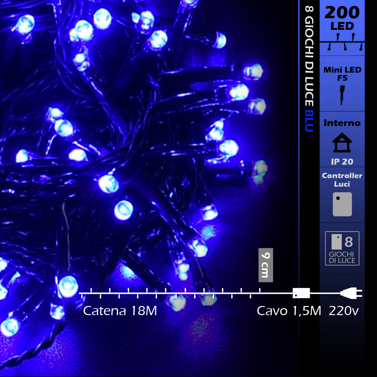 La Catena luminosa WISDOM 200 LED da 18M luce BLU cavo verde, utilizzando la tecnologia LED è in genere più efficiente dal punto di vista energetico rispetto alle luci tradizionali a incandescenza. Inoltre, i LED sono in grado di emettere luce in una vasta gamma di colori e modelli, dando molta libertà nella scelta della modalità di illuminazione. La catena luminosa WISDOM 200 LED con cavo verde in corrente diretta 220V è applicabile in esterni ed interni. Adatta come decorazione e allestimento di case, vetrine e spazi interni ma perfetta anche per addobbare giardini, gazebi e spazi all'aperto grazie al suo grado di protezione IP 44. Munita di controller con 8 diverse modalità di luce tra cui scegliere, come lampeggiante, scintillante, luce fissa, onde, dissolvenza, sfumature e altro ancora. Essendo alimentata in corrente diretta, la catena luminosa può essere utilizzata in modo sicuro all'interno della casa, come ad esempio per decorare l'albero di Natale, la camera da letto, il soggiorno o qualsiasi altro ambiente. Il cavo di colore verde potrebbe essere particolarmente adatto per essere nascosto tra le piante o i mobili per creare un effetto più naturale e discreto. La sua alta qualità costruttiva la rende resistente alle intemperie e all'umidità, garantendo una lunga durata. La sua installazione è facile e sicura grazie ai materiali di alta qualità utilizzati