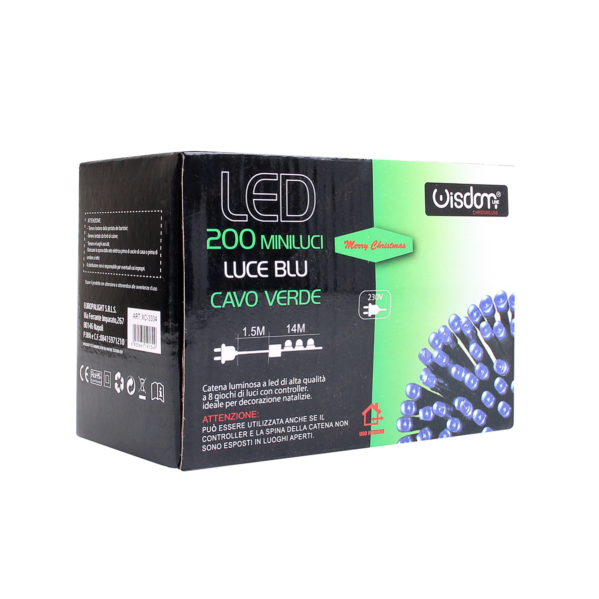 La Catena luminosa WISDOM 200 LED da 18M luce BLU cavo verde, utilizzando la tecnologia LED è in genere più efficiente dal punto di vista energetico rispetto alle luci tradizionali a incandescenza. Inoltre, i LED sono in grado di emettere luce in una vasta gamma di colori e modelli, dando molta libertà nella scelta della modalità di illuminazione. La catena luminosa WISDOM 200 LED con cavo verde in corrente diretta 220V è applicabile in esterni ed interni. Adatta come decorazione e allestimento di case, vetrine e spazi interni ma perfetta anche per addobbare giardini, gazebi e spazi all'aperto grazie al suo grado di protezione IP 44. Munita di controller con 8 diverse modalità di luce tra cui scegliere, come lampeggiante, scintillante, luce fissa, onde, dissolvenza, sfumature e altro ancora. Essendo alimentata in corrente diretta, la catena luminosa può essere utilizzata in modo sicuro all'interno della casa, come ad esempio per decorare l'albero di Natale, la camera da letto, il soggiorno o qualsiasi altro ambiente. Il cavo di colore verde potrebbe essere particolarmente adatto per essere nascosto tra le piante o i mobili per creare un effetto più naturale e discreto. La sua alta qualità costruttiva la rende resistente alle intemperie e all'umidità, garantendo una lunga durata. La sua installazione è facile e sicura grazie ai materiali di alta qualità utilizzati