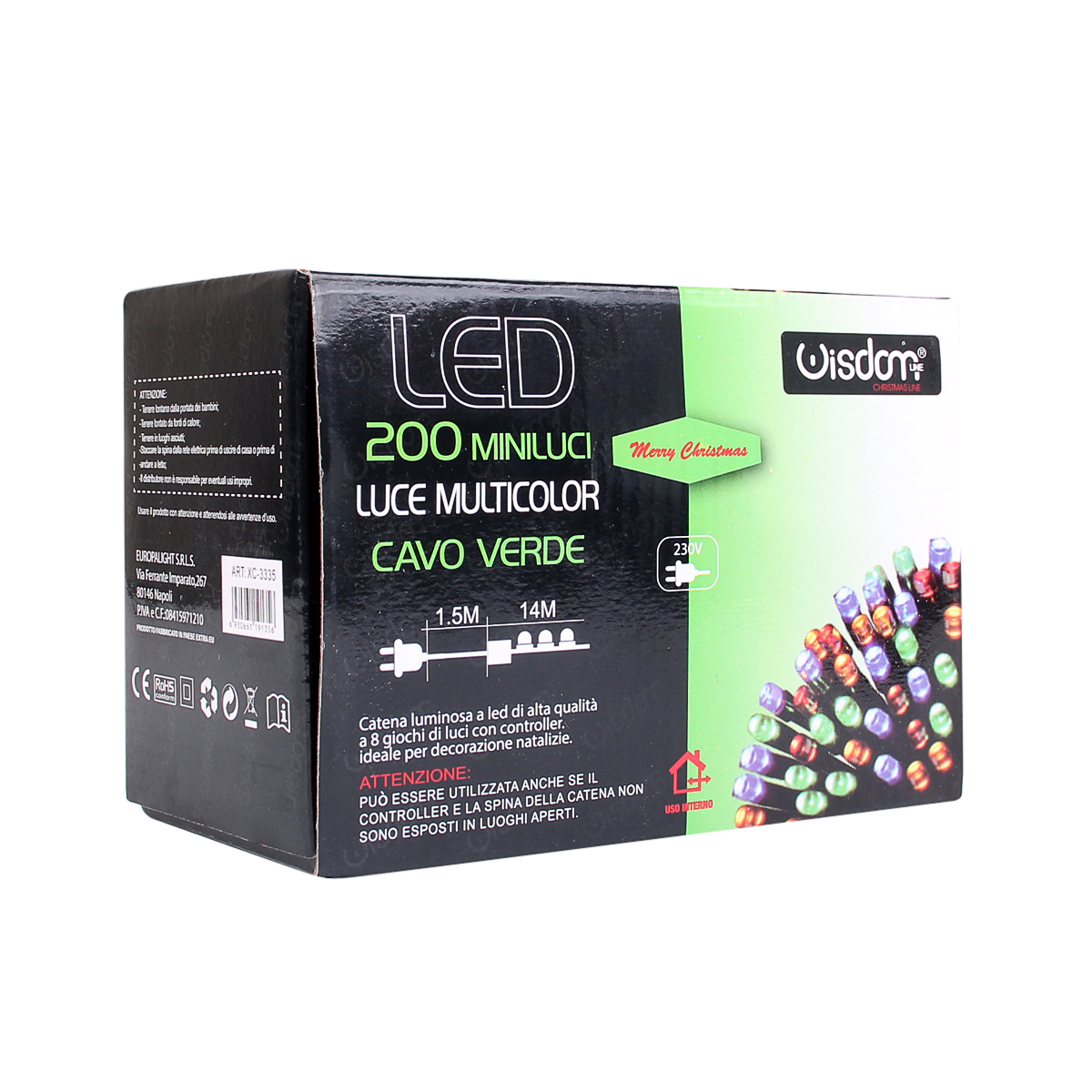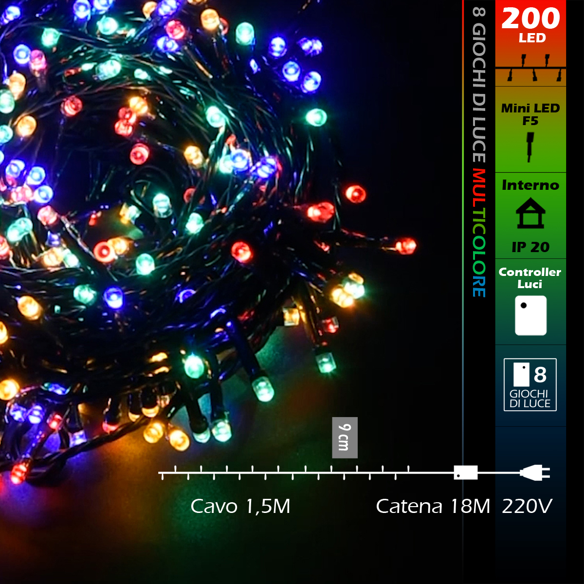 La Catena luminosa WISDOM 200 LED da 18M luce MULTICOLORE cavo verde, utilizzando la tecnologia LED è in genere più efficiente dal punto di vista energetico rispetto alle luci tradizionali a incandescenza. Inoltre, i LED sono in grado di emettere luce in una vasta gamma di colori e modelli, dando molta libertà nella scelta della modalità di illuminazione. La catena luminosa WISDOM 200 LED con cavo verde in corrente diretta 220V è applicabile in esterni ed interni. Adatta come decorazione e allestimento di case, vetrine e spazi interni ma perfetta anche per addobbare giardini, gazebi e spazi all'aperto grazie al suo grado di protezione IP 44. Munita di controller con 8 diverse modalità di luce tra cui scegliere, come lampeggiante, scintillante, luce fissa, onde, dissolvenza, sfumature e altro ancora. Essendo alimentata in corrente diretta, la catena luminosa può essere utilizzata in modo sicuro all'interno della casa, come ad esempio per decorare l'albero di Natale, la camera da letto, il soggiorno o qualsiasi altro ambiente. Il cavo di colore verde potrebbe essere particolarmente adatto per essere nascosto tra le piante o i mobili per creare un effetto più naturale e discreto. La sua alta qualità costruttiva la rende resistente alle intemperie e all'umidità, garantendo una lunga durata. La sua installazione è facile e sicura grazie ai materiali di alta qualità utilizzati