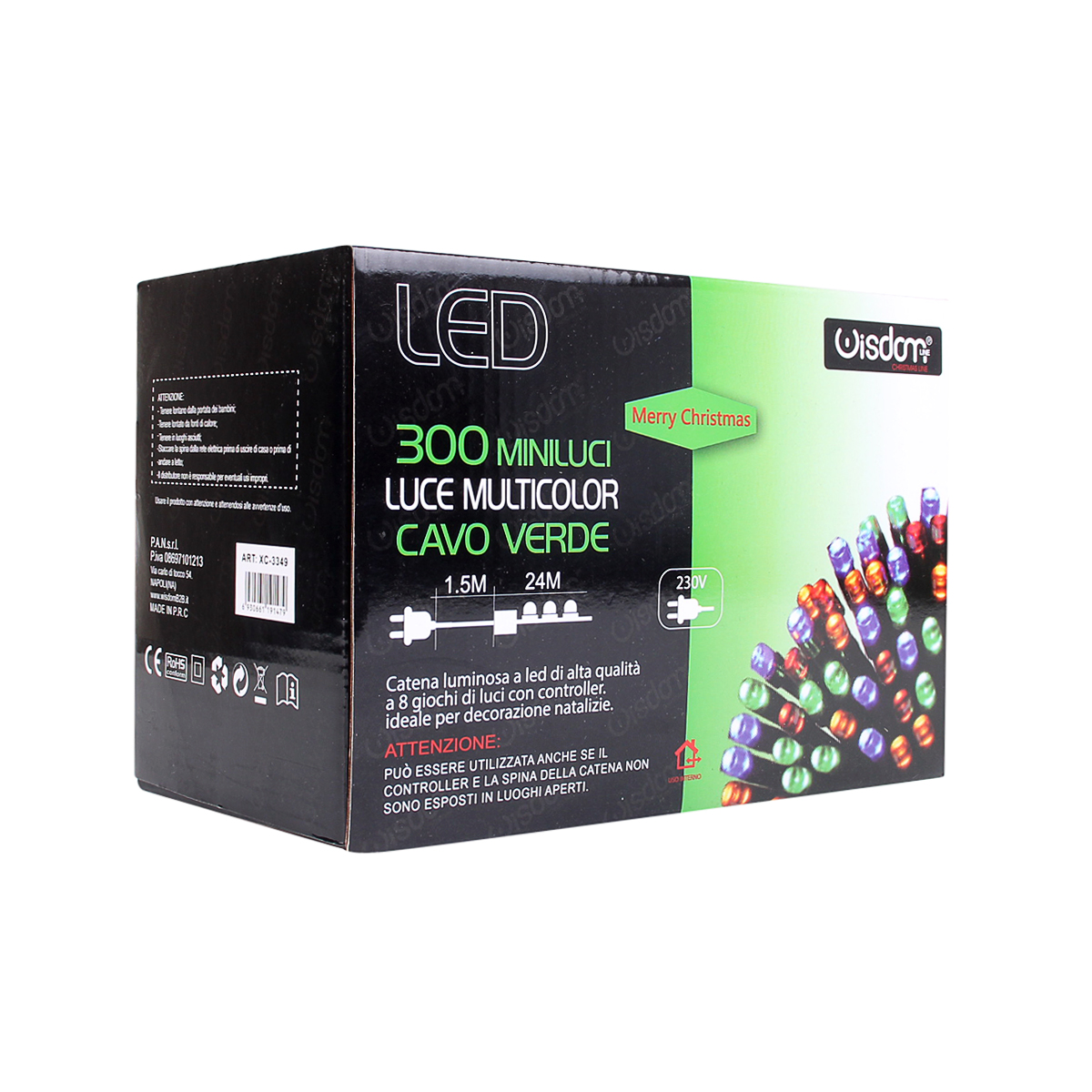 La Catena luminosa WISDOM 300 LED da 24M luce MULTICOLORE cavo verde, utilizzando la tecnologia LED è in genere più efficiente dal punto di vista energetico rispetto alle luci tradizionali a incandescenza. Inoltre, i LED sono in grado di emettere luce in una vasta gamma di colori e modelli, dando molta libertà nella scelta della modalità di illuminazione. La catena luminosa WISDOM 300 LED con cavo verde in corrente diretta 220V è applicabile in esterni ed interni. Adatta come decorazione e allestimento di case, vetrine e spazi interni ma perfetta anche per addobbare giardini, gazebi e spazi all'aperto grazie al suo grado di protezione IP 44. Munita di controller con 8 diverse modalità di luce tra cui scegliere, come lampeggiante, scintillante, luce fissa, onde, dissolvenza, sfumature e altro ancora. Essendo alimentata in corrente diretta, la catena luminosa può essere utilizzata in modo sicuro all'interno della casa, come ad esempio per decorare l'albero di Natale, la camera da letto, il soggiorno o qualsiasi altro ambiente. Il cavo di colore verde potrebbe essere particolarmente adatto per essere nascosto tra le piante o i mobili per creare un effetto più naturale e discreto. La sua alta qualità costruttiva la rende resistente alle intemperie e all'umidità, garantendo una lunga durata. La sua installazione è facile e sicura grazie ai materiali di alta qualità utilizzati