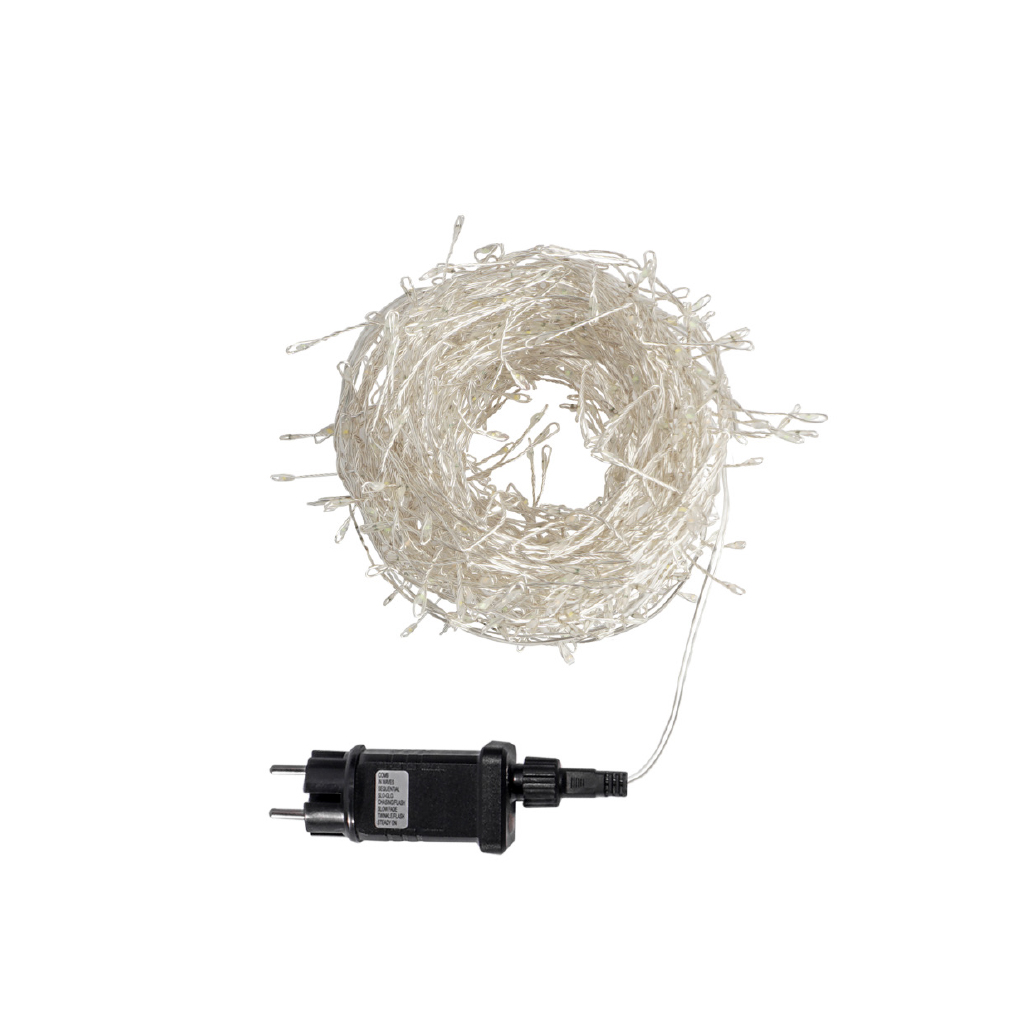 Catena luminosa microled frastagliata con cavo metal flessibile. Con trasformatore 31V a bassa tensione ed una lunghezza di 3 metri con 300 microled risulta ideale per allestimenti sia in ambienti interni che in ambienti esterni