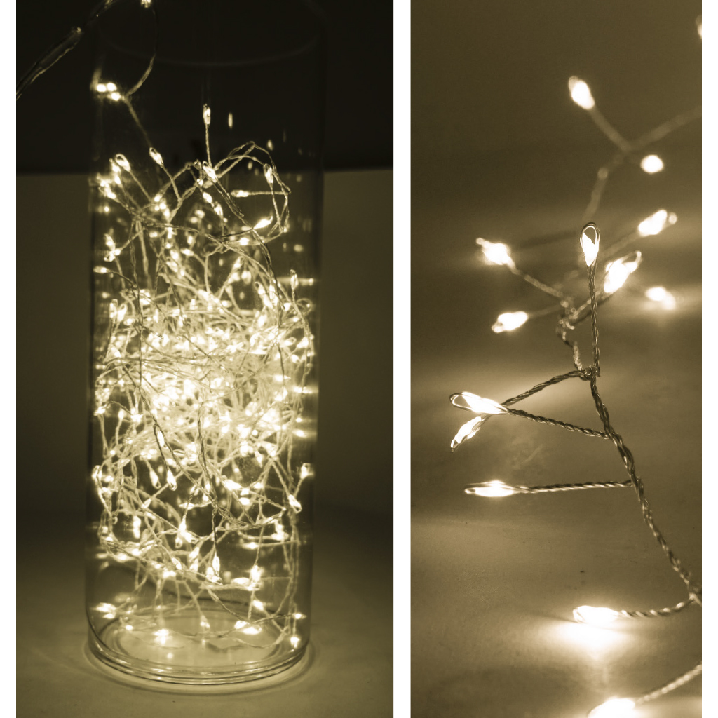 Catena luminosa microled frastagliata con cavo metal flessibile. Con trasformatore 31V a bassa tensione ed una lunghezza di 3 metri con 300 microled risulta ideale per allestimenti sia in ambienti interni che in ambienti esterni