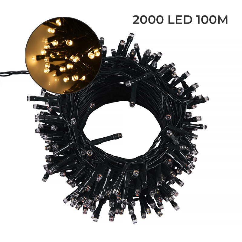Immergiti in un mondo di luce e colore con la nostra esclusiva catena di luci LED, una soluzione di illuminazione versatile ed efficiente dal punto di vista energetico, perfetta per arricchire ogni ambiente. Con 2000 LED gialli brillanti distribuiti lungo 100 metri di cavo verde, questa catena luminosa è stata progettata per trasformare giardini, terrazze, sale eventi, o qualsiasi spazio interno, in scenari magici e accoglienti. La nostra catena di luci è alimentata da un trasformatore 31V, inclusivo di presa Schuko, garantendo sicurezza e facilità di utilizzo sia in ambienti interni che esterni. Grazie alla classe energetica A+, offre un'illuminazione di qualità con un notevole risparmio energetico, rispettando l'ambiente e riducendo i costi in bolletta. Il colore giallo dei LED, simbolo di calore e accoglienza, insieme alla flessibilità del cavo verde, permette di creare atmosfere intime e suggestive, adatte a ogni occasione. Che si tratti di decorare un albero di Natale, di illuminare una festa in giardino o di aggiungere un tocco di magia a matrimoni e eventi speciali, la nostra catena luminosa è la scelta ideale per chi cerca un'illuminazione che unisce stile, efficienza e versatilità. Ogni LED della catena è posizionato a una distanza di 5 cm l'uno dall'altro, assicurando una distribuzione uniforme della luce. La tensione di alimentazione (220-240V AC) e la frequenza (50/60 Hz) rendono il prodotto compatibile con la maggior parte delle installazioni elettriche domestiche. La catena di luci include 8 giochi di luce preimpostati, permettendo di variare l'atmosfera secondo il mood desiderato: da effetti statici a sequenze dinamiche, ogni impostazione è studiata per valorizzare al meglio lo spazio circostante. Realizzata con materiali di alta qualità, come gomma e rame, assicura durabilità e resistenza agli agenti atmosferici, grazie anche al grado di protezione IP44. Questo la rende ideale non solo per l'uso interno, ma anche per resistere a condizioni esterne, mantenendo le sue caratteristiche luminose e cromatiche nel tempo. In sintesi, la nostra catena di luci LED non è solo un elemento decorativo, ma un vero e proprio strumento per trasformare qualsiasi ambiente in uno spazio unico e personale. Che si voglia creare un'atmosfera romantica, festiva o semplicemente rilassante, la flessibilità e la qualità della nostra offerta luminosa rispondono a tutte le esigenze, unendo efficienza energetica e design sofisticato