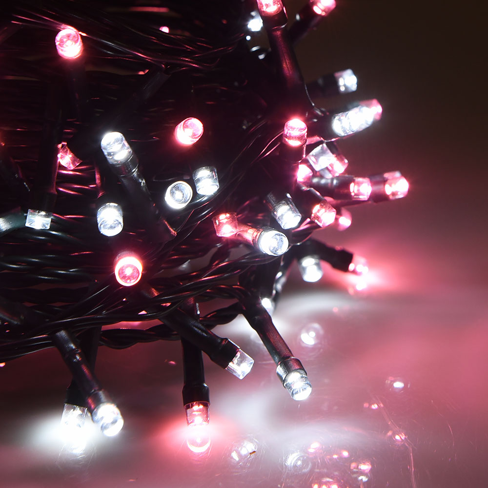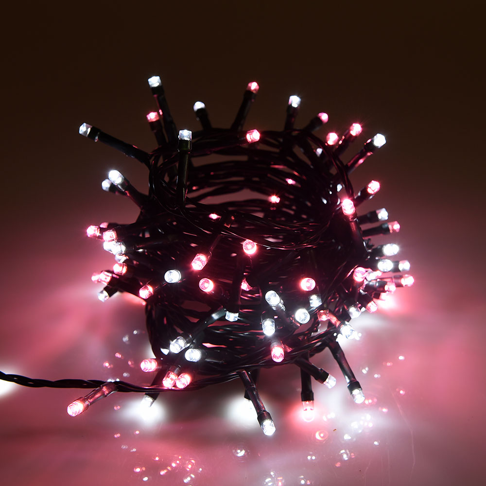 Infografica Catena 300 Luci LED Rosa e Bianche Cavo Verde da 15 Metri Basso Consumo