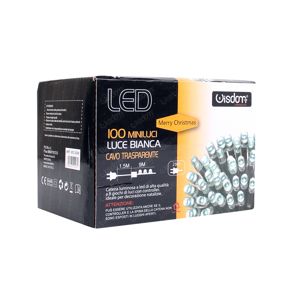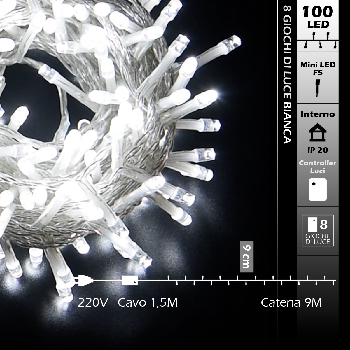Catena luminosa led con alimentazione diretta in corrente domestica 220V e cavo di alimentazione da 1,5M. Con grado di protezione IP20, è utilizzabile esclusivamente in ambienti interni e risulta validissima nella decorazione di alberi di Natale