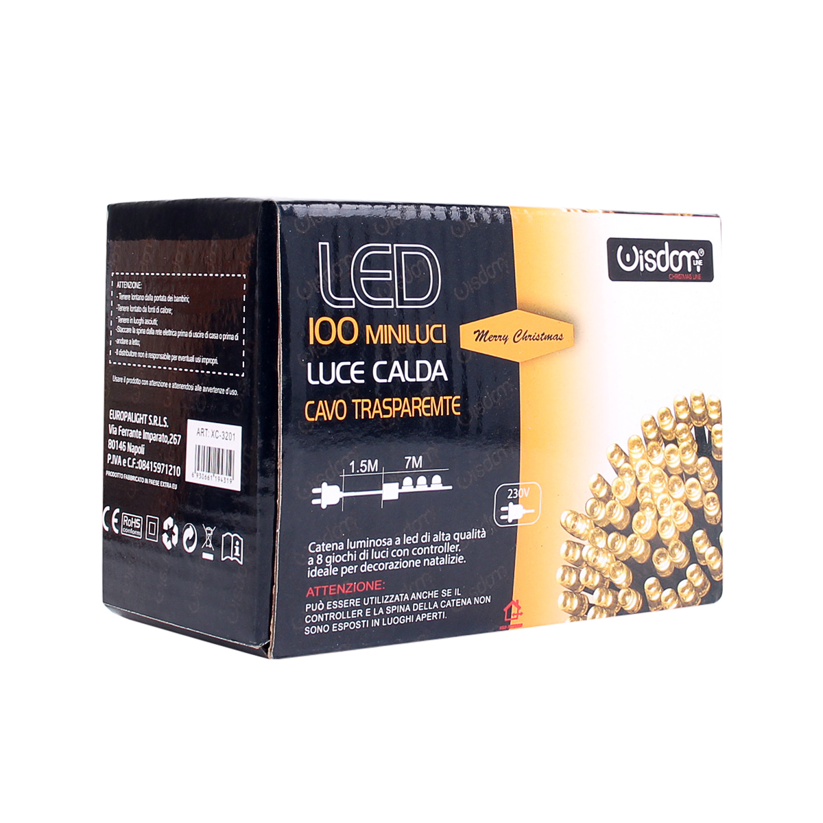 Catena luminosa led con alimentazione diretta in corrente domestica 220V e cavo di alimentazione da 1,5M con 8 giochi di luce calda 9M cavo trasparente. Con grado di protezione IP20, è utilizzabile esclusivamente in ambienti interni e risulta validissima nella decorazione di alberi di Natale