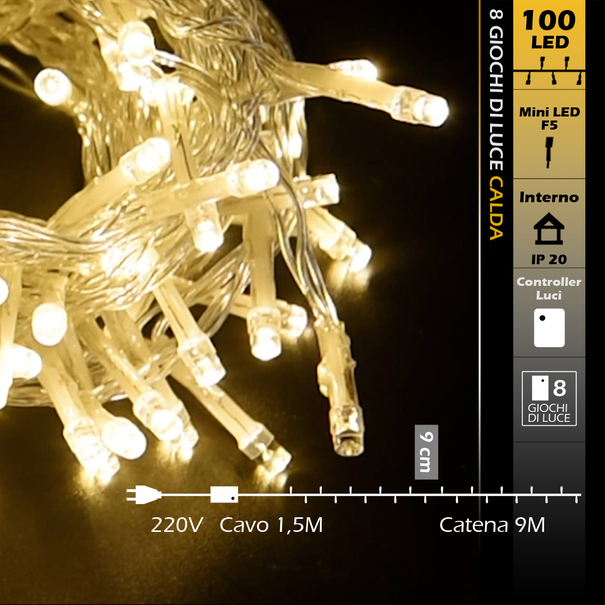 Catena luminosa led con alimentazione diretta in corrente domestica 220V e cavo di alimentazione da 1,5M con 8 giochi di luce calda 9M cavo trasparente. Con grado di protezione IP20, è utilizzabile esclusivamente in ambienti interni e risulta validissima nella decorazione di alberi di Natale