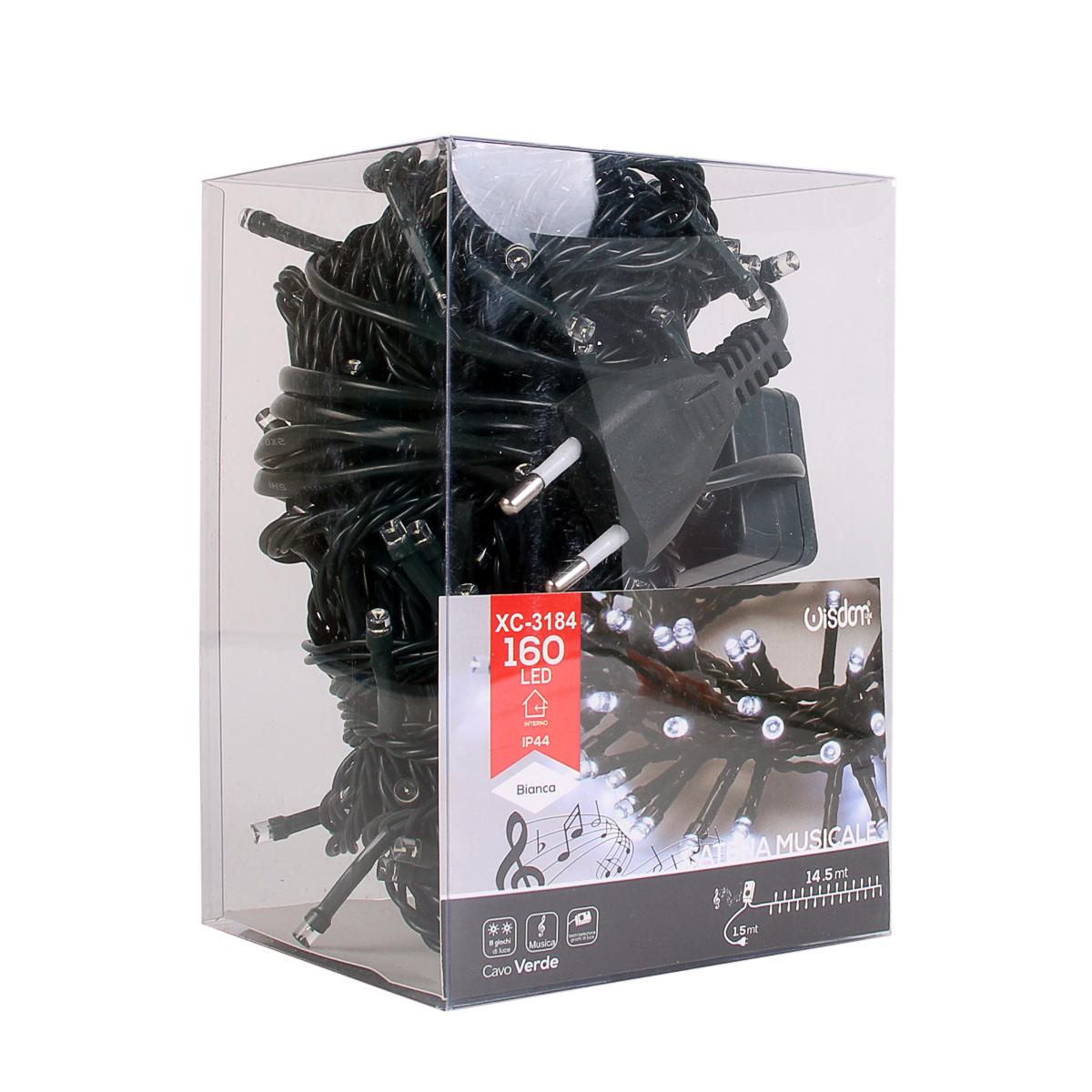 Catena luminosa led con alimentazione diretta in corrente domestica 220V e cavo di alimentazione da 1,5M.. Con grado di protezione IP20, è utilizzabile esclusivamente in ambienti interni e risulta validissima nella decorazione di alberi di Natale. Munita di 8 giochi di luce bianca comprensivi di luce fissa e di 7 melodie musicali con velocità regolabile