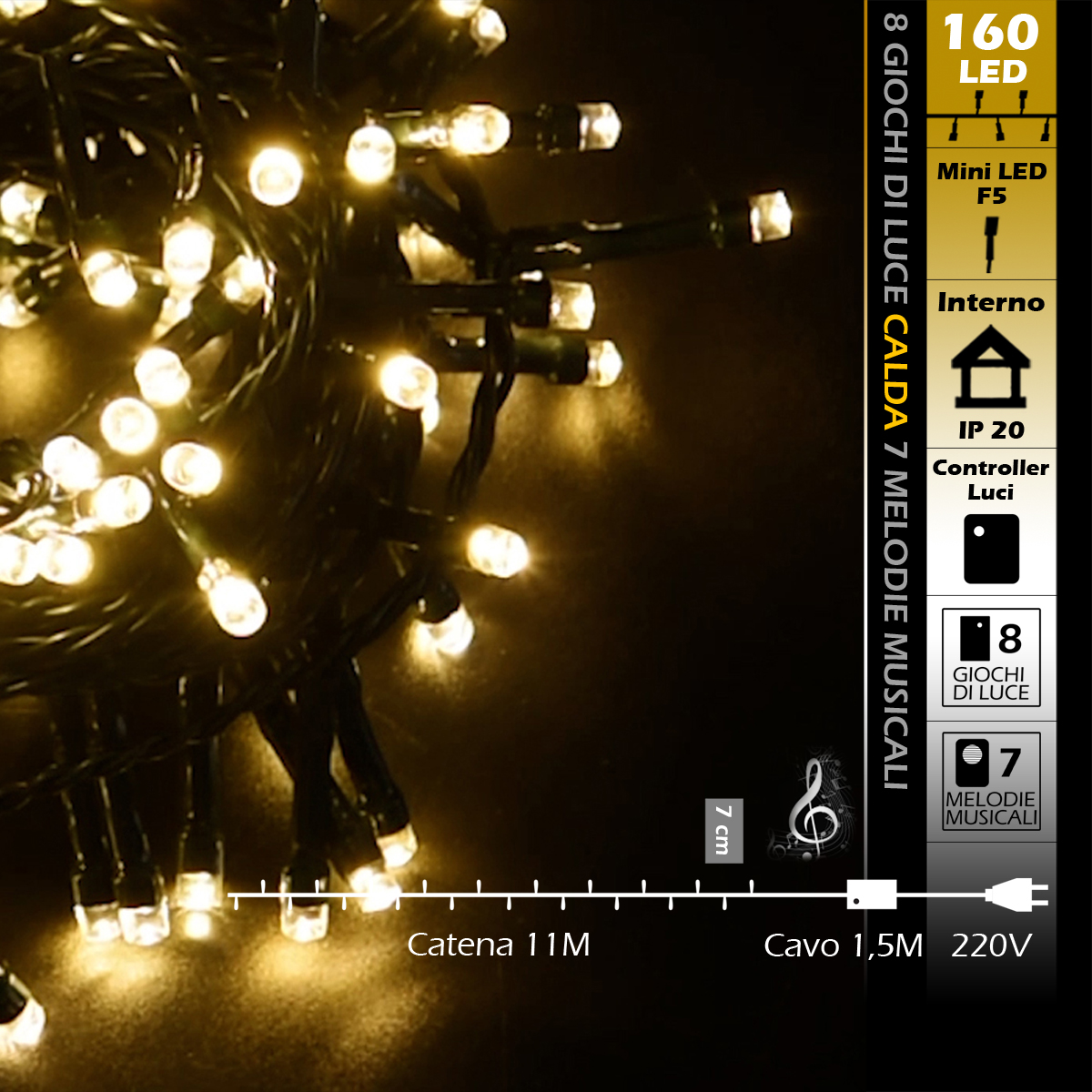 CATENA LUMINOSA 160 LED MUSICALE 11M CALDA CAVO VERDE 220V