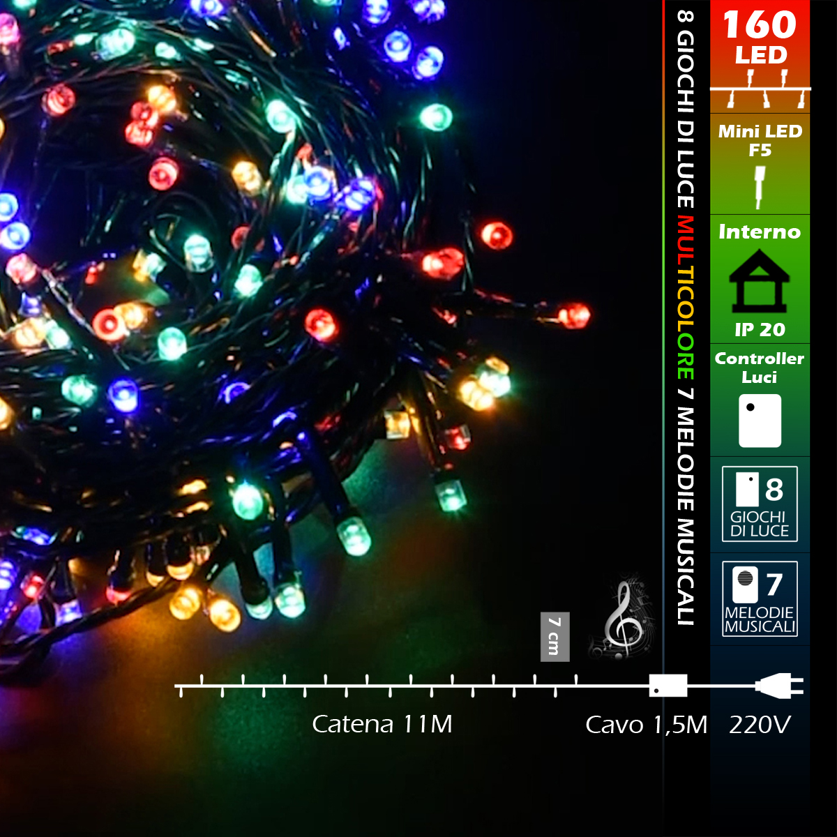 CATENA LUMINOSA 160 LED MUSICALE 11M MULTICOLORE CAVO VERDE 220V