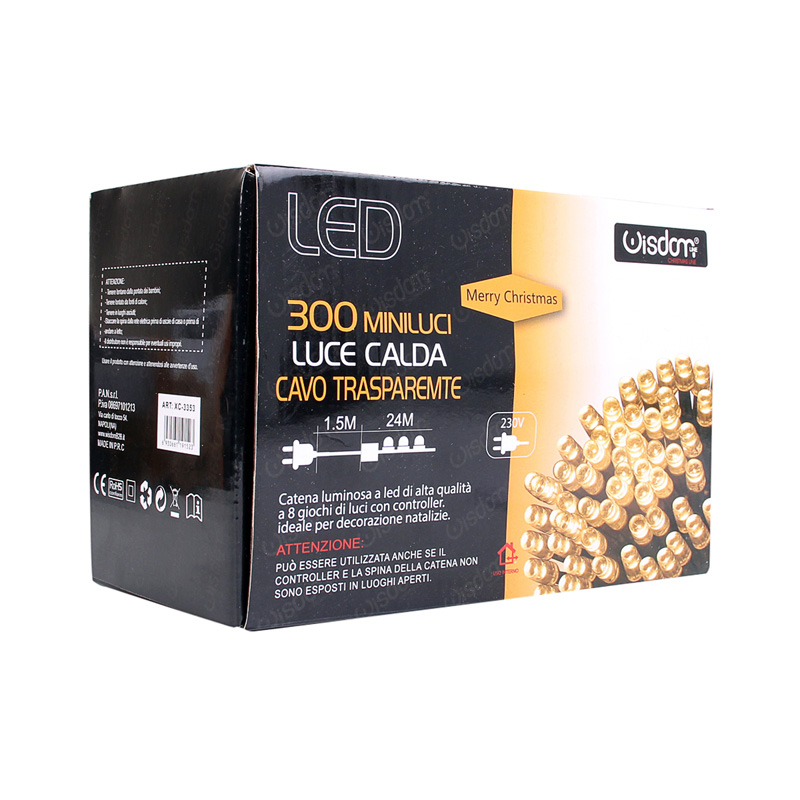 La Catena Luminosa Wisdom da 300 LED è una soluzione di illuminazione che combina eleganza e sostenibilità, ideale per arricchire qualsiasi spazio interno. Questa catena luminosa, con i suoi 24 metri di lunghezza e un cavo trasparente, non si limita a essere un semplice accessorio decorativo, ma diventa un elemento chiave nell'illuminazione di ambienti interni. L'eleganza della luce calda emessa dai LED crea un'atmosfera accogliente e rilassante, perfetta per vari ambienti come salotti, camere da letto, e per eventi speciali. La versatilità di questa catena è ulteriormente evidenziata dalla sua flessibilità, che permette di adattarsi facilmente a diverse forme e spazi. La sostenibilità è un aspetto fondamentale di questa catena luminosa. Alimentata a 220V e con una frequenza di 50/60 Hz, garantisce un'illuminazione efficiente riducendo il consumo energetico. I LED Reflex F5 utilizzati sono noti per la loro lunga durata e basso consumo, rendendo questo prodotto una scelta ecologica e vantaggiosa nel lungo periodo. La catena luminosa è realizzata con materiali di alta qualità come gomma e rame, che garantiscono resistenza e flessibilità. Il grado di protezione IP 20 assicura una buona resistenza agli agenti interni. Il cavo trasparente si fonde armoniosamente con l'arredamento, aggiungendo un tocco di raffinatezza e discrezione. Dotata di 8 giochi di luce preimpostati, questa catena offre la possibilità di creare diverse atmosfere in base alle esigenze. L'attacco con spina europea a 2 poli ne facilita l'installazione, rendendo il prodotto accessibile a tutti, senza necessità di competenze tecniche specifiche. Ideale per una vasta gamma di applicazioni, dalla decorazione natalizia a eventi come matrimoni o feste di compleanno, questa catena luminosa si adatta perfettamente anche come illuminazione permanente in spazi come caffetterie, ristoranti o negozi. La sua capacità di creare un'atmosfera calda e accogliente la rende preziosa per ogni occasione. La sicurezza è un altro aspetto cruciale di questo prodotto. Progettata per essere sicura al tocco e ridurre i rischi di surriscaldamento, la sua affidabilità è garantita dalla qualità dei materiali e dalla progettazione attenta. In linea con le preoccupazioni ambientali, questa catena luminosa LED rappresenta una scelta responsabile. L'uso di LED ad alta efficienza energetica riduce l'impatto ambientale, contribuendo a un futuro più sostenibile e promuovendo un consumo consapevole. In conclusione, la Catena Luminosa Wisdom 300 LED è un prodotto che unisce estetica, efficienza energetica, versatilità e responsabilità ambientale. Ideale per chi cerca un'illuminazione di qualità, decorativa e rispettosa dell'ambiente, questa catena luminosa è una soluzione eccellente per ogni esigenza di illuminazione interna