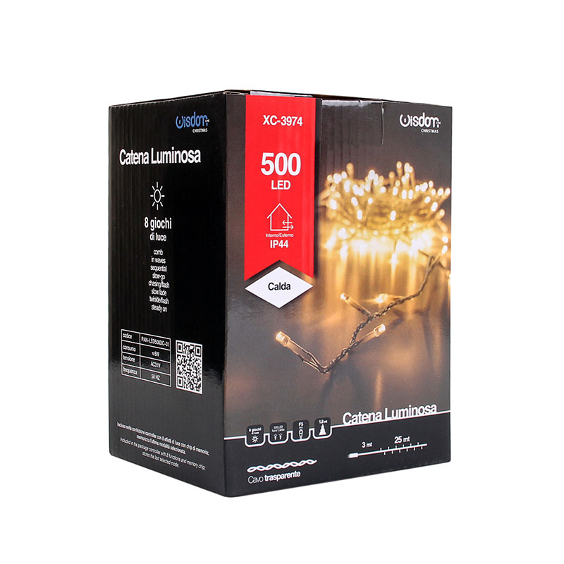 La Catena Luminosa Wisdom 500 LED da 25M Luce Calda con Cavo Trasparente rappresenta una soluzione illuminativa ideale per coloro che cercano un'atmosfera accogliente e romantica in varie occasioni. Questa catena, lunga 25 metri, è dotata di 500 LED di colore caldo, offrendo un'illuminazione soffusa e avvolgente, perfetta per creare un'ambiente magico ed incantevole. Le luci LED, di tipo Reflex F5, sono disposte lungo un filo trasparente flessibile, che permette di adattarsi facilmente a qualsiasi ambiente e superficie. La distanza di 5 cm tra ogni LED assicura una distribuzione uniforme della luce, ideale per illuminare alberi di Natale, finestre, pareti, giardini, tavoli e altre aree. La sicurezza è un aspetto fondamentale di questa catena luminosa. Il trasformatore incluso, compatibile con prese Schuko, riduce la tensione di alimentazione standard (220-240V AC, 50 Hz) a 31V, garantendo un uso sicuro anche in ambienti domestici. Questo sistema a bassa tensione non solo aumenta la sicurezza, ma è anche più efficiente dal punto di vista energetico rispetto alle tradizionali catene luminose. Una caratteristica distintiva di questa catena luminosa è la varietà di modalità di illuminazione disponibili. Con 8 diversi giochi di luce preimpostati, gli utenti possono scegliere tra modalità come lampeggiante, scintillante, luce fissa, onde, dissolvenza, sfumature e altro, per adattarsi a ogni occasione o preferenza personale. Il design versatile di questa catena luminosa la rende perfetta per una varietà di occasioni. Che si tratti di un matrimonio, una festa di compleanno, un evento aziendale o semplicemente per aggiungere un tocco magico alle decorazioni natalizie, queste luci LED si adattano perfettamente a ogni esigenza. Il loro design discreto e l'eleganza della luce calda le rendono un'aggiunta meravigliosa a qualsiasi tipo di decorazione. In termini di materiali, la catena è realizzata con una combinazione di gomma e rame, assicurando durabilità e flessibilità. Il grado di protezione IP 44 indica che queste luci sono protette contro gli agenti atmosferici, rendendole adatte per l'uso sia interno che esterno. Con un cavo di alimentazione di 3 metri, la catena luminosa offre anche una grande versatilità in termini di posizionamento, permettendo di raggiungere facilmente prese elettriche e di estendersi in grandi spazi. Le luci LED sono note per la loro lunga durata e basso consumo energetico. Questa catena luminosa non fa eccezione, offrendo ore di illuminazione senza consumare eccessiva energia. Questo la rende una scelta ecologica ed economicamente vantaggiosa per l'illuminazione decorativa. Che sia per decorare un evento speciale o per aggiungere un tocco di magia alle feste natalizie, questa catena luminosa è garantita per creare l'atmosfera perfetta