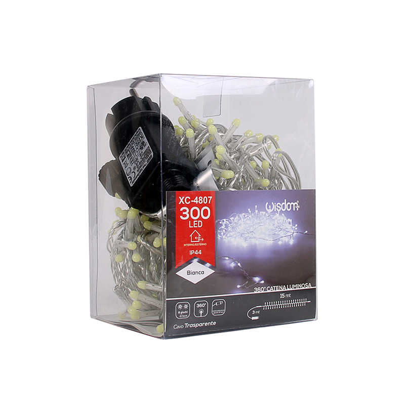 Scopri la magia e l'eleganza della nostra Catena Luminosa LED, un accessorio di design che combina funzionalità e stile per trasformare qualsiasi ambiente. Questa catena luminosa, lunga 15 metri, è dotata di 300 mini LED bianchi che emettono una luce brillante e avvolgente a 360°, creando un'atmosfera accogliente e suggestiva. Il cavo, flessibile e trasparente, si integra armoniosamente con qualsiasi decoro, rendendolo ideale per allestire spazi interni come salotti, camere da letto, vetrine di negozi, o per eventi speciali come matrimoni e feste. La sua versatilità la rende perfetta anche per l'uso esterno: giardini, terrazze, balconi, e gazebi diventeranno scenari incantati grazie a questa illuminazione raffinata. La catena luminosa è progettata per garantire la massima sicurezza e durata. Il cavo è realizzato in filo di rame placcato in argento con un rivestimento in PVC, che assicura resistenza e flessibilità. Il trasformatore 31V a bassa tensione, con presa Schuko, garantisce un utilizzo sicuro e conforme agli standard europei. La frequenza di 50/60 Hz e la tensione di alimentazione di 31V AC rendono questa catena luminosa un'opzione efficiente e a basso consumo energetico. Uno degli aspetti più affascinanti di questa catena luminosa è la sua funzionalità: dotata di un controller, offre 8 diversi giochi di luce preimpostati, inclusa l'opzione di luce fissa. Questa caratteristica permette di cambiare l'atmosfera dell'ambiente in base alle occasioni o alle preferenze personali, rendendo ogni momento unico. In termini di sicurezza, la catena luminosa supera le aspettative con il suo grado di protezione IP44, che la rende resistente agli agenti atmosferici e adatta all'uso esterno. Il design elegante e minimalista del cavo trasparente si fonde perfettamente con l'ambiente circostante, garantendo un effetto visivo di grande impatto senza essere invadente. Con una lunghezza di 15 metri e un cavo di alimentazione aggiuntivo di 3 metri, questa catena luminosa è sufficientemente lunga per coprire ampie aree, sia in ambienti interni che esterni. La sua installazione è semplice e intuitiva, permettendoti di creare facilmente l'atmosfera desiderata. Le luci bianche della catena, con un angolo di illuminazione a 360°, assicurano una distribuzione uniforme della luce, creando un effetto scenografico di grande impatto. Che tu stia cercando di aggiungere un tocco di eleganza alla tua casa, decorare un evento speciale o semplicemente creare un'atmosfera accogliente e rilassante, questa catena luminosa LED è la scelta ideale. In conclusione, la nostra Catena Luminosa LED non è solo un semplice accessorio di illuminazione, ma un vero e proprio elemento di design capace di trasformare qualsiasi spazio. La combinazione di stile, versatilità e funzionalità la rende un prodotto indispensabile per chiunque desideri creare un ambiente unico e suggestivo. Non perdere l'occasione di rendere i tuoi spazi speciali con questa elegante soluzione di illuminazione. Acquista ora la tua Catena Luminosa LED e inizia a sperimentare con la luce l'arte di creare atmosfere uniche e memorabili
