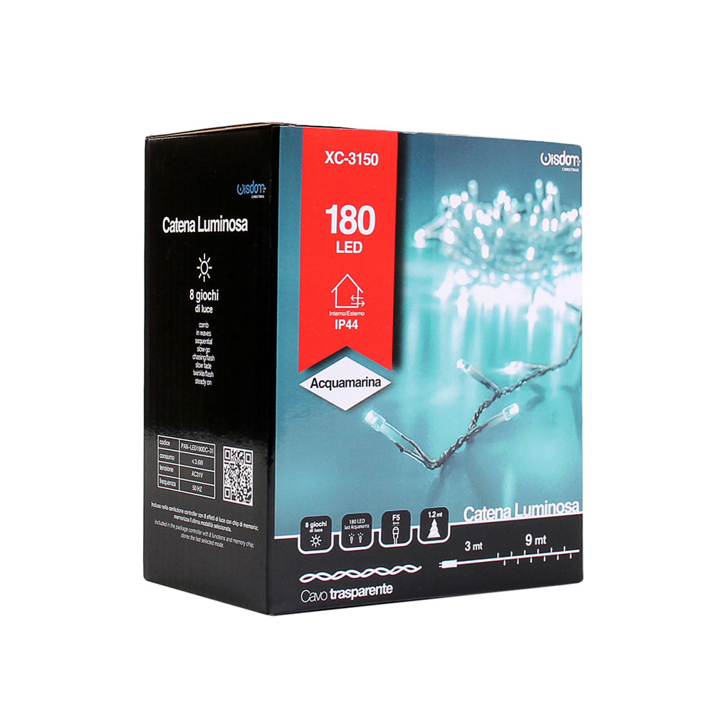 Infografica Catena LED 180 Luci Acquamarina Cavo Trasparente da 9 metri Trasformatore 31V