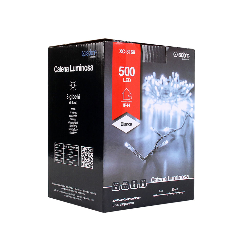 Scopri la bellezza e l'efficienza della nostra Catena Luminosa WISDOM con 500 LED Bianchi. Questa decorazione luminosa di 25 metri, con un cavo trasparente quasi invisibile, è la scelta perfetta per aggiungere un tocco di eleganza a qualsiasi evento, sia esso un matrimonio, una festa o l'atmosfera natalizia. Grazie al suo design raffinato e alla luminosità intensa ma non invadente, questa catena luminosa è un must-have per ogni occasione. La nostra catena luminosa non è solo bella da vedere, ma è anche costruita con la massima attenzione alla sicurezza e all'efficienza energetica. Il trasformatore di corrente, incluso, riduce la tensione di alimentazione standard (220-240V AC) a una più sicura e gestibile 31V, rendendo queste luci un'opzione sicura e affidabile per l'uso domestico e professionale. Inoltre, il basso consumo energetico dei LED assicura un impatto minimo sulla bolletta elettrica, permettendoti di godere di una luce brillante senza preoccupazioni. Questa catena luminosa è incredibilmente versatile. Con 8 giochi di luce preimpostati, puoi scegliere tra modalità come lampeggiante, scintillante, luce fissa, onde, dissolvenza, sfumature e altro ancora, per creare l'atmosfera perfetta per ogni occasione. Che tu stia decorando un albero di Natale, illuminando una stanza, o creando un ambiente suggestivo in giardino, queste luci si adattano a ogni esigenza. Il design flessibile e robusto della catena rende l'installazione semplice e intuitiva. Puoi facilmente avvolgerla attorno agli alberi, drappeggiarla su tavoli, o appenderla lungo le pareti e le finestre. La distanza di 5 cm tra ogni LED garantisce una distribuzione uniforme della luce, creando un effetto luminoso sorprendente ma equilibrato. La qualità dei materiali utilizzati per questa catena luminosa è eccellente. Ogni LED è del tipo Reflex F5, noto per la sua luminosità e durabilità. Il cavo, fatto di una combinazione di gomma e rame, è sia flessibile che resistente, ideale per un utilizzo prolungato. Inoltre, con un grado di protezione IP 44, queste luci sono resistenti agli agenti atmosferici, rendendole adatte sia per interni che per esterni. La lunghezza totale di 25 metri offre ampie possibilità di decorazione, mentre il cavo di alimentazione da 3 metri ti consente di posizionarle anche lontano dalle prese elettriche. Il trasformatore 31V con presa Schuko è facile da collegare e garantisce una sicurezza ottimale. L'alta frequenza di 50/60 Hz assicura una luminosità costante senza sfarfallii, creando un'atmosfera accogliente e rilassante. Le nostre luci LED bianche sono perfette per ogni occasione, dalla decorazione domestica alle grandi celebrazioni. Grazie al loro stile semplice ma elegante, si adattano a qualsiasi ambiente, aggiungendo un tocco di classe e luminosità. Sono l'opzione ideale per chi cerca una soluzione di illuminazione pratica, sicura, ed efficiente dal punto di vista energetico