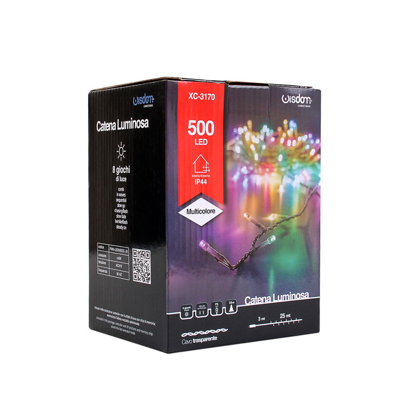 Immagina di trasformare il tuo giardino, terrazza o qualsiasi spazio esterno in un vero e proprio angolo di paradiso con una magica catena luminosa multicolore. La nostra Catena Luminosa LED di 25 metri, dotata di 500 luci LED brillanti, è la soluzione ideale per chi cerca una decorazione luminosa di qualità superiore che crei un'atmosfera indimenticabile. Questa catena luminosa non è solo un semplice accessorio decorativo, è un vero e proprio strumento per trasformare ogni evento in qualcosa di speciale. Con i suoi 8 diversi giochi di luce preimpostati, potrai scegliere l'effetto più adatto per ogni occasione, sia che si tratti di una festa di compleanno all'aperto, di un romantico matrimonio in giardino, o semplicemente per aggiungere un tocco di magia alle tue serate estive. La catena è incredibilmente flessibile e facile da installare, adattandosi perfettamente a qualsiasi forma o struttura. Che tu voglia avvolgerla attorno a un albero, drappeggiarla lungo un pergolato o illuminare un sentiero, la sua versatilità è ineguagliabile. Inoltre, la distanza di 5 cm tra i LED garantisce una distribuzione uniforme della luce, creando un effetto visivo sorprendente. Il colore multicolore delle luci LED, combinato con la loro intensità e brillantezza, offre un effetto scenografico unico. Che tu stia cercando di creare un ambiente festoso, romantico o semplicemente rilassante, questa catena luminosa è la scelta perfetta. In termini di sicurezza e durabilità, la nostra catena luminosa è progettata per resistere agli elementi esterni. Il grado di protezione IP 44 la rende idonea per l'uso all'aperto, proteggendola da schizzi d'acqua e condizioni meteorologiche variabili. Il cavo di alimentazione lungo 3 metri offre grande flessibilità nella scelta del punto di installazione, mentre il trasformatore 31V con presa Schuko assicura un utilizzo sicuro e affidabile. Inoltre, grazie alla tecnologia LED Reflex F5, questa catena luminosa è incredibilmente efficiente dal punto di vista energetico, garantendo un consumo ridotto senza compromettere la luminosità e la qualità della luce. La durata delle luci LED assicura che la tua decorazione luminosa possa essere utilizzata stagione dopo stagione, rendendendola un investimento a lungo termine per la tua casa o per i tuoi eventi. Pensata per chi ama la bellezza e la funzionalità, questa catena luminosa è ideale non solo per le festività natalizie, ma anche per qualsiasi evento all'aperto. Le sue luci multicolore possono essere utilizzate per decorare alberi di Natale, illuminare le notti estive o aggiungere un tocco di magia a matrimoni, compleanni, barbecue, e qualsiasi altra celebrazione. La facilità di installazione e la maneggevolezza sono ulteriori punti di forza di questo prodotto. Non avrai bisogno di attrezzi o competenze speciali per creare la tua atmosfera da sogno. Semplicemente, stendi la catena dove preferisci, collega il trasformatore e sei pronto per goderti uno spettacolo luminoso che lascerà tutti a bocca aperta. Per chi cerca una soluzione di illuminazione che combini stile, versatilità e qualità, questa catena luminosa è senza dubbio la scelta ideale. Regalati e ai tuoi ospiti momenti indimenticabili sotto un cielo stellato di luci colorate, creando ricordi che dureranno per sempre