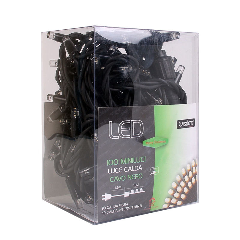 Scopri il fascino delle festività con la nostra esclusiva Catena Luminosa Wisdom 100 MaxiLED. Perfetta per creare un'atmosfera natalizia incantevole, questa catena luminosa professionale offre un'illuminazione calda e accogliente, ideale per abbellire il tuo albero di Natale o per aggiungere un tocco magico alla tua casa durante le festività. La nostra catena luminosa, lunga 10 metri, è dotata di 100 MaxiLED Reflex F8 che emettono una luce calda, capace di creare un ambiente romantico e festivo. Il design flessibile e la lunghezza generosa rendono questa catena adatta a svariate applicazioni, sia interne che esterne. Il cavo di colore nero, robusto e durevole, si integra armoniosamente con qualsiasi decorazione, garantendo al contempo un'elevata resistenza agli agenti atmosferici. La catena è facilmente collegabile e prolungabile fino a 20 pezzi, grazie agli appositi connettori situati su entrambi i lati. Questa caratteristica la rende estremamente versatile e adattabile a diversi spazi e configurazioni. Che tu voglia decorare un piccolo balcone o un ampio giardino, la Catena Luminosa Wisdom 100 MaxiLED è la scelta ideale. La catena offre un'illuminazione versatile con il 90% di luce fissa e il 10% di luce intermittente, permettendoti di scegliere l'atmosfera più adatta al tuo spazio e al tuo evento. Grazie alla tensione di alimentazione di 220-240V AC e una frequenza di 50/60 Hz, questa catena luminosa garantisce un'illuminazione costante e affidabile. Realizzata con materiali di alta qualità, come gomma e rame, la Catena Luminosa Wisdom 100 MaxiLED offre una durata eccezionale e un grado di protezione IP 44, garantendo così una lunga vita utile e resistenza a diverse condizioni climatiche. Il suo design elegante e la funzionalità rendono questa catena luminosa un accessorio indispensabile per le tue decorazioni natalizie. Inoltre, il collegamento con la spina Schuko assicura una facile installazione e un utilizzo sicuro, permettendoti di godere della bellezza delle luci senza preoccupazioni. Che tu stia decorando per una festa intima o per un grande evento, la Catena Luminosa Wisdom 100 MaxiLED aggiungerà sicuramente un tocco di eleganza e calore. Ideale per ogni tipo di evento natalizio, questa catena luminosa trasformerà i tuoi spazi in un paradiso di luci scintillanti, creando ricordi indimenticabili per te e per i tuoi ospiti. È la soluzione perfetta per chi cerca un'illuminazione di qualità, versatile e dall'aspetto raffinato. In conclusione, la Catena Luminosa Wisdom 100 MaxiLED è molto più di un semplice accessorio natalizio. È un investimento nella bellezza e nell'atmosfera delle tue festività, garantendo momenti magici e un'illuminazione di classe per tutte le tue celebrazioni
