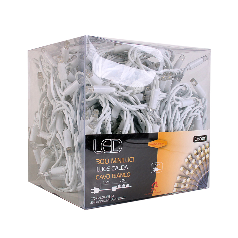La catena luminosa WISDOM 300 Maxiled rappresenta il top di gamma nel settore dell'illuminazione professionale, con la sua lunghezza di 30 metri e un design che combina eleganza e versatilità. Questa soluzione di illuminazione è ideale sia per ambienti interni che esterni, offrendo una luminosità uniforme e suggestiva. La combinazione di luce calda e bianca intermittente crea un'atmosfera accogliente e incantevole, rendendola perfetta per qualsiasi occasione. Il cavo gommato bianco da 4mm e reflex da 8mm conferisce alla catena WISDOM un aspetto raffinato e una resistenza superiore. Ogni LED è coibentato singolarmente e protetto da un rivestimento in resina epossidica, che garantisce una protezione ottimale contro l'umidità, la polvere e altri agenti esterni. Questo la rende una scelta affidabile per l'uso in ambienti esterni, come giardini, terrazze, e anche per eventi all'aperto. L'alimentazione in corrente diretta (220V) con spina Schuko assicura una facile installazione e un utilizzo sicuro. I connettori Fast Connect permettono di collegare e prolungare la catena fino a 20 pezzi, offrendo una soluzione flessibile per progetti di illuminazione di grandi dimensioni. La modalità di illuminazione combina il 90% di luce calda fissa con il 10% di luce bianca intermittente, creando un effetto di scintillio che impreziosisce qualsiasi ambiente. Questa caratteristica rende la catena WISDOM 300 Maxiled ideale per decorare alberi di Natale, creare percorsi luminosi in giardini o semplicemente per aggiungere un tocco di eleganza a case, negozi, ristoranti, hotel e qualsiasi altro spazio. La durata e l'affidabilità sono assicurate dal grado di protezione IP44, che rende la catena resistente alle intemperie e all'umidità, garantendo così una lunga vita del prodotto. I materiali utilizzati, gomma e rame, sono scelti per la loro qualità e durabilità, contribuendo ulteriormente alla resistenza e alla sicurezza del prodotto. In termini di specifiche tecniche, la catena WISDOM 300 Maxiled offre una tensione di alimentazione di 220-240V AC e una frequenza di 50/60 Hz. La presenza di 300 LED Reflex F8 assicura una luminosità intensa e una distribuzione uniforme della luce lungo tutta la lunghezza della catena. Il colore caldo e bianco della luce è progettato per adattarsi a diversi stili e ambienti, offrendo così una versatilità senza pari. Con la sua combinazione unica di design elegante, funzionalità avanzate e materiali di alta qualità, questa catena luminosa rappresenta una scelta eccellente per chi cerca un'illuminazione affidabile, versatile e di grande impatto visivo