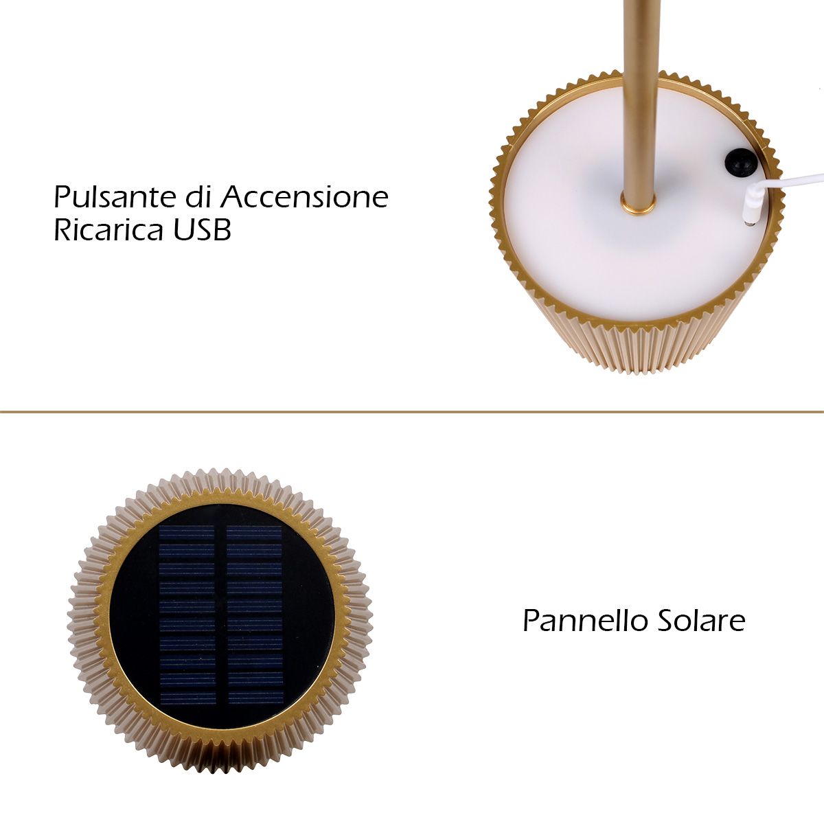 La lampada da tavolo a LED colore oro con ricarica solare e USB rappresenta la perfetta combinazione tra estetica, funzionalità e sostenibilità. Pensata per ambienti moderni come ristoranti, bar, terrazze, giardini o ambienti interni domestici, questa lampada offre un’elegante soluzione d’illuminazione senza compromessi. Grazie al suo design compatto con paralume tondo plissettato e finitura dorata, si adatta armoniosamente a qualsiasi stile di arredamento, dal contemporaneo al classico.