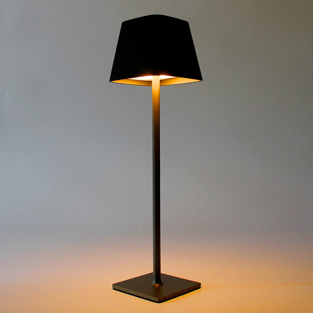 Il design sobrio ed elegante, con paralume plissettato nero quadrato, si adatta perfettamente a qualsiasi tipo di arredamento, dal moderno al classico. Le linee pulite e minimali rendono questa lampada da tavolo un elemento d’arredo raffinato e funzionale. Può essere posizionata su scrivanie, comodini, tavoli da pranzo o esterni coperti, diventando un punto luce d’effetto.