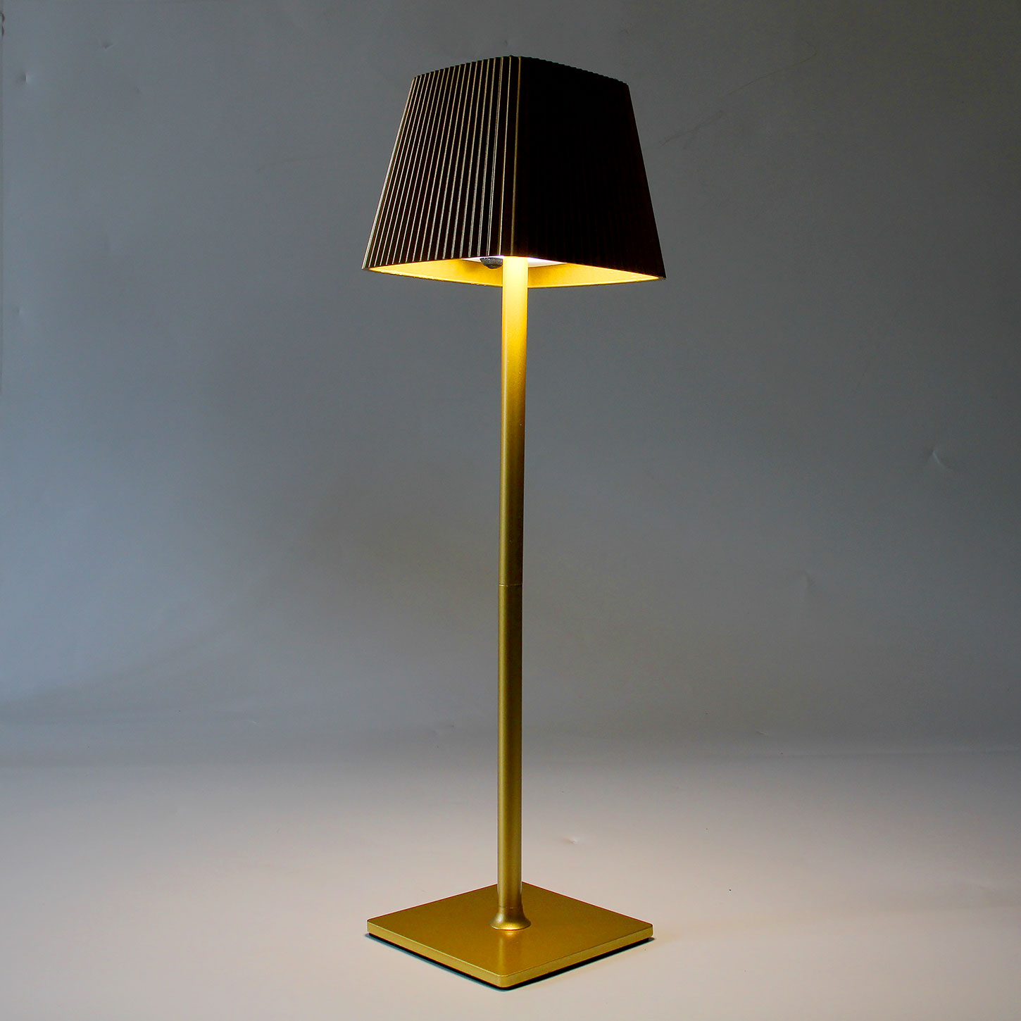 La lampada è caratterizzata da una struttura in metallo resistente, impreziosita da una finitura dorata lucida che ne esalta il carattere raffinato. Il suo paralume quadrato plissettato, realizzato con cura nei dettagli, non solo aggiunge un tocco di classe all’arredo ma consente anche una diffusione uniforme della luce, creando un’atmosfera calda e rilassante. La forma a cono troncato con base quadrata e le dimensioni compatte (38 x 9,5 x 10,8 cm) la rendono perfetta per essere collocata ovunque: su un comodino, un tavolino da salotto, una scrivania, un tavolo da giardino o anche su un balcone. È la soluzione ideale per chi ama coniugare design contemporaneo e funzionalità pratica.