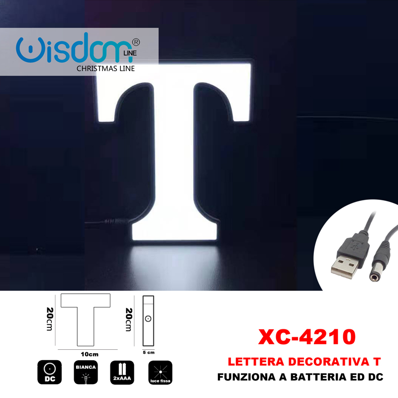 Lettera decorativa luminosa T a batteria 2xAAA o DC da 20cm