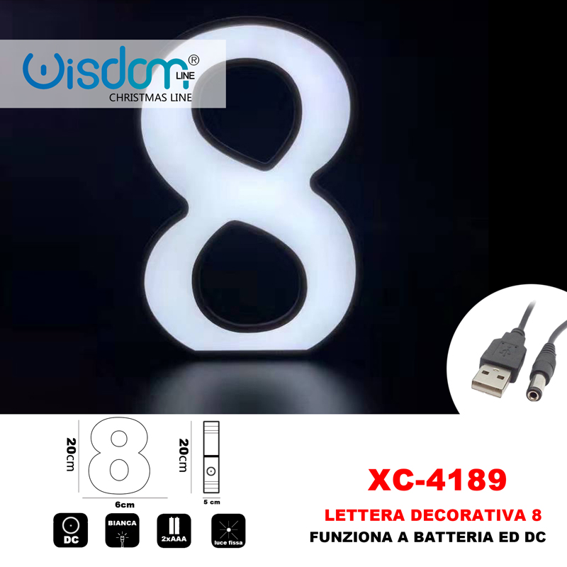 Numero luminoso 8 con alimentazione a batteria (2x AAA) oppure con trasformatore dc 5v. Misure: Altezza numero 20cm , larghezza 10cm e profondità 6cm