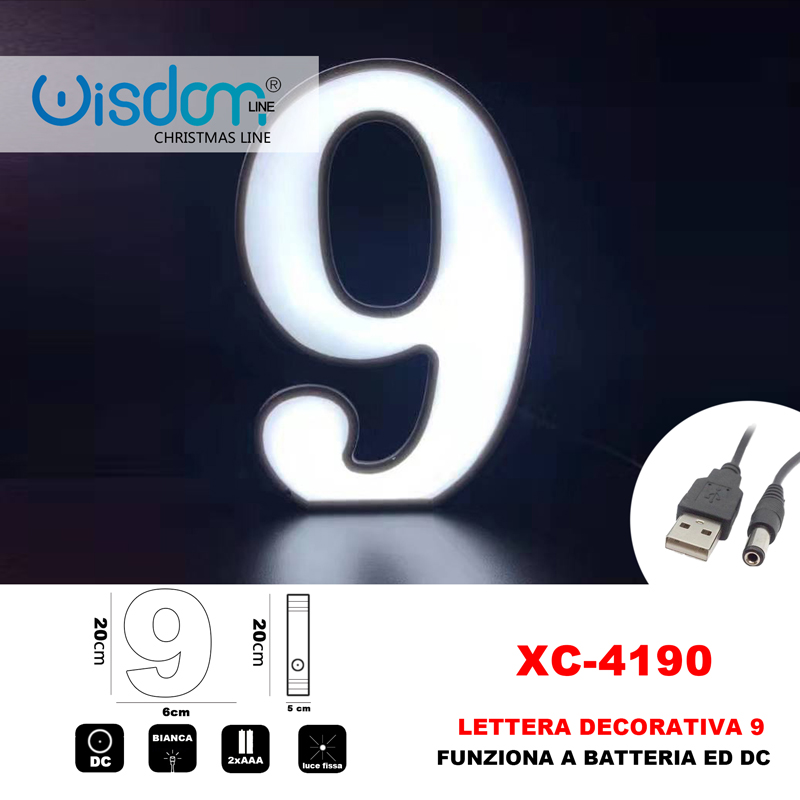 Numero luminoso 9 con alimentazione a batteria (2x AAA) oppure con trasformatore dc 5v Misure: Altezza numero 20cm , larghezza 10cm e profondità 6cm