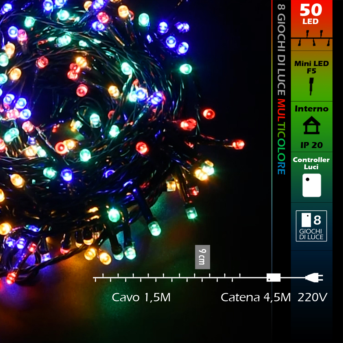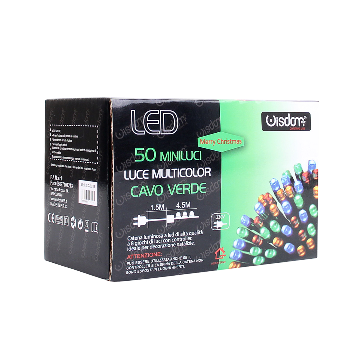 La Catena luminosa WISDOM 50 LED da 4,5M luce MULTICOLORE cavo verde, utilizzando la tecnologia LED è in genere più efficiente dal punto di vista energetico rispetto alle luci tradizionali a incandescenza. Inoltre, i LED sono in grado di emettere luce in una vasta gamma di colori e modelli, dando molta libertà nella scelta della modalità di illuminazione. La catena luminosa WISDOM 50 LED con cavo verde in corrente diretta 220V è applicabile in esterni ed interni. Adatta come decorazione e allestimento di case, vetrine e spazi interni ma perfetta anche per addobbare giardini, gazebi e spazi all'aperto grazie al suo grado di protezione IP 44. Munita di controller con 8 diverse modalità di luce tra cui scegliere, come lampeggiante, scintillante, luce fissa, onde, dissolvenza, sfumature e altro ancora. Essendo alimentata in corrente diretta, la catena luminosa può essere utilizzata in modo sicuro all'interno della casa, come ad esempio per decorare l'albero di Natale, la camera da letto, il soggiorno o qualsiasi altro ambiente. Il cavo di colore verde potrebbe essere particolarmente adatto per essere nascosto tra le piante o i mobili per creare un effetto più naturale e discreto. La sua alta qualità costruttiva la rende resistente alle intemperie e all'umidità, garantendo una lunga durata. La sua installazione è facile e sicura grazie ai materiali di alta qualità utilizzati