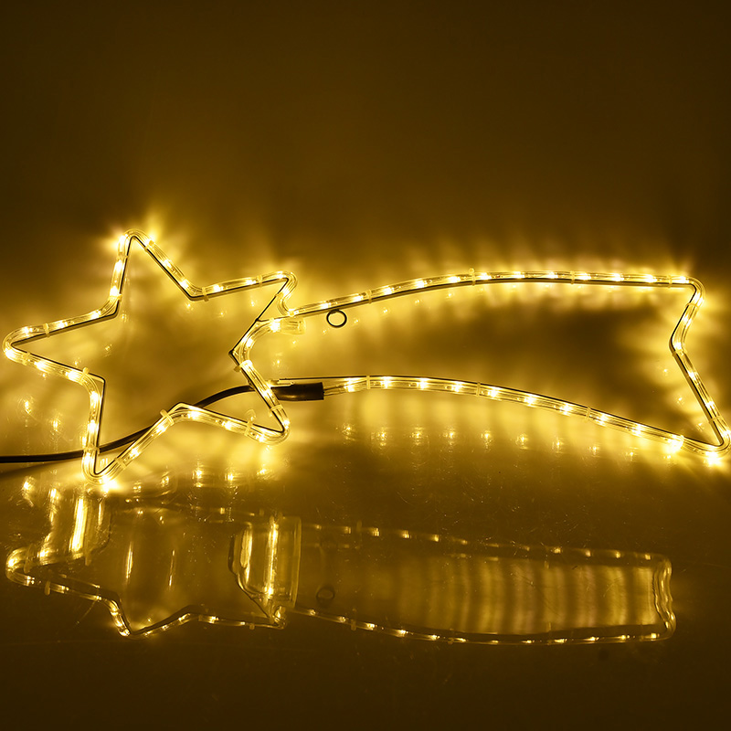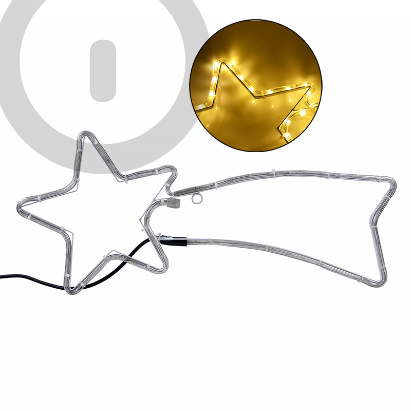 La Stella Cometa Luminosa LED è un elemento decorativo versatile e affascinante, ideale per aggiungere un tocco di luce e magia sia agli spazi interni che esterni. Questa decorazione natalizia, dotata di 60 LED ad alta efficienza luminosa, si distingue per la sua straordinaria luminosità e il colore caldo e accogliente, perfetto per creare un'atmosfera festiva e calda. Realizzata con materiali di alta qualità, la Stella Cometa ha un grado di protezione IP44, rendendola resistente agli agenti atmosferici e adatta all'uso esterno. La sua lunghezza di 2 metri, con un flessibile tubo dotato di 30 LED per metro, permette una facile installazione e adattabilità a diverse superfici e ambienti. Il controller incluso offre la possibilità di scegliere tra 8 diversi giochi di luce preimpostati, offrendo così una varietà di effetti visivi per adattarsi a ogni occasione e preferenza. Che si tratti di un'illuminazione statica o di effetti dinamici, la stella cometa LED saprà catturare l'attenzione e creare un'atmosfera unica. La tensione di alimentazione è di 220-240V AC con una frequenza di 50/60 Hz, rendendo la stella cometa sicura e affidabile. La lunghezza del cavo di 1,5 metri con spina Schuko assicura una facile connessione alla rete elettrica domestica, mentre l'angolo di illuminazione a 360° garantisce una visibilità ottimale da ogni direzione. In termini di dimensioni, la stella cometa misura 75x25 cm, dimensione ideale per essere visibile e decorativa senza essere ingombrante. Il colore trasparente dei LED e del tubo flessibile si adatta perfettamente a qualsiasi contesto decorativo, aggiungendo un tocco di eleganza e raffinatezza. Oltre a essere un'ottima scelta per la decorazione natalizia domestica, questa stella cometa luminosa è anche ideale per eventi, locali, vetrine e decorazioni pubbliche, grazie alla sua versatilità e durabilità. È una scelta eccellente per chi cerca una soluzione di illuminazione decorativa che combini stile, qualità e funzionalità