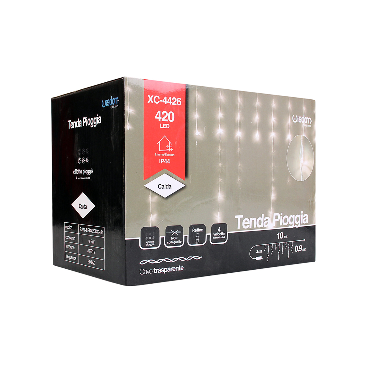 Tenda led con effetto pioggia luce bianca e cavo trasparente. Alimentata a bassa tensione 31v ha 4 velocità memorizzabili ed è adatta ad un utilizzo in esterni