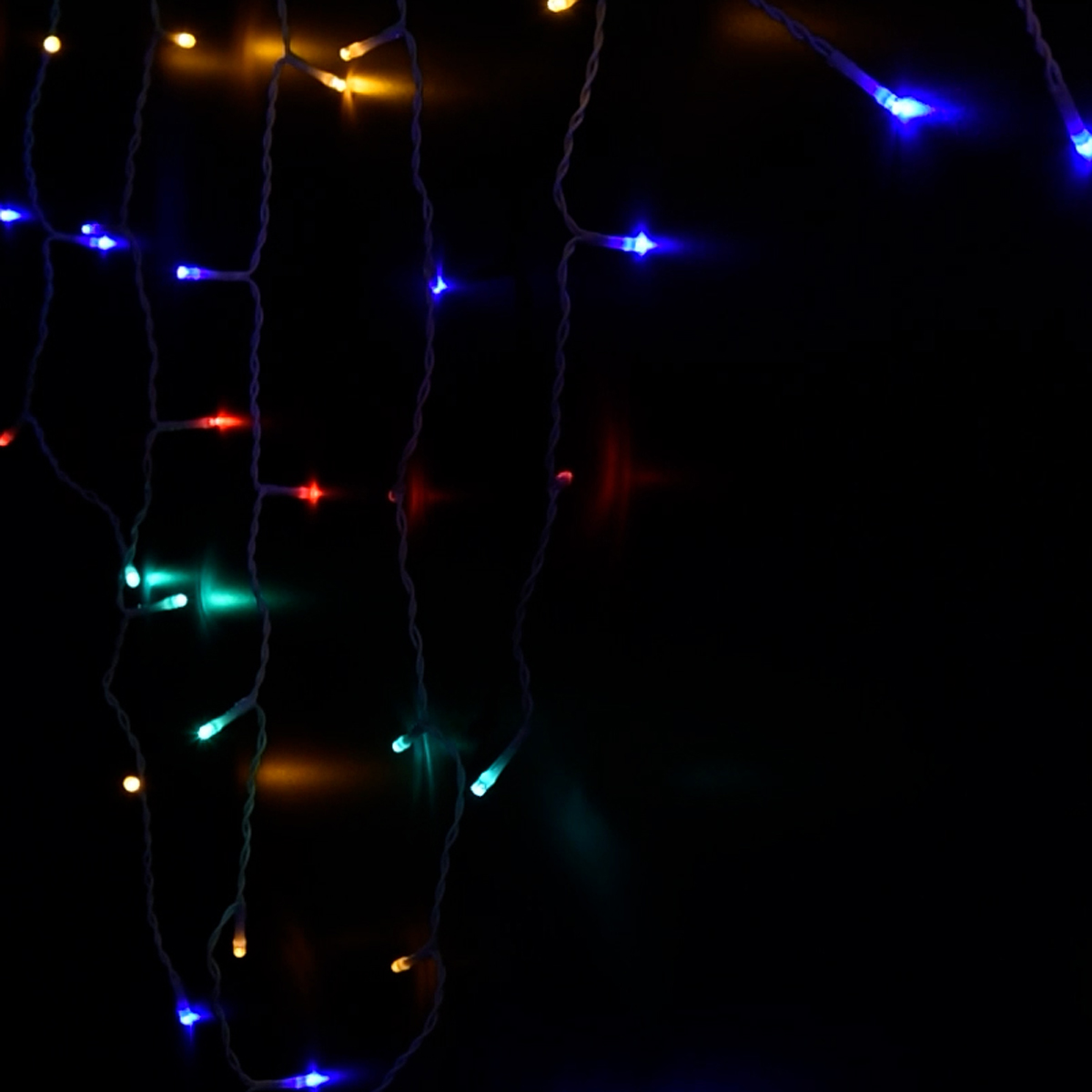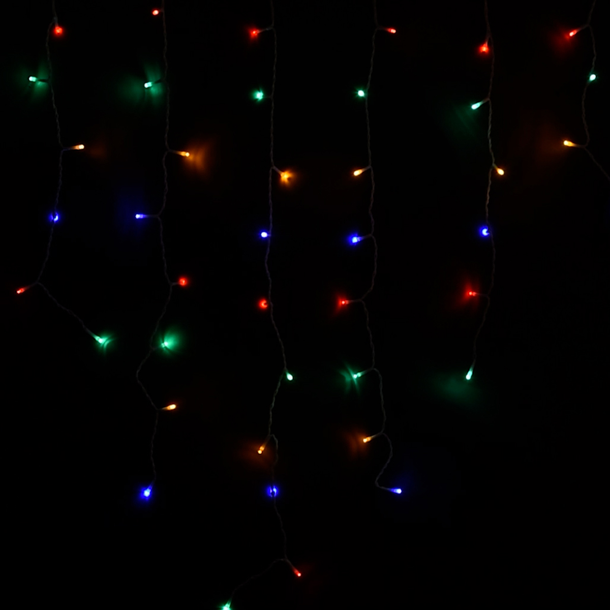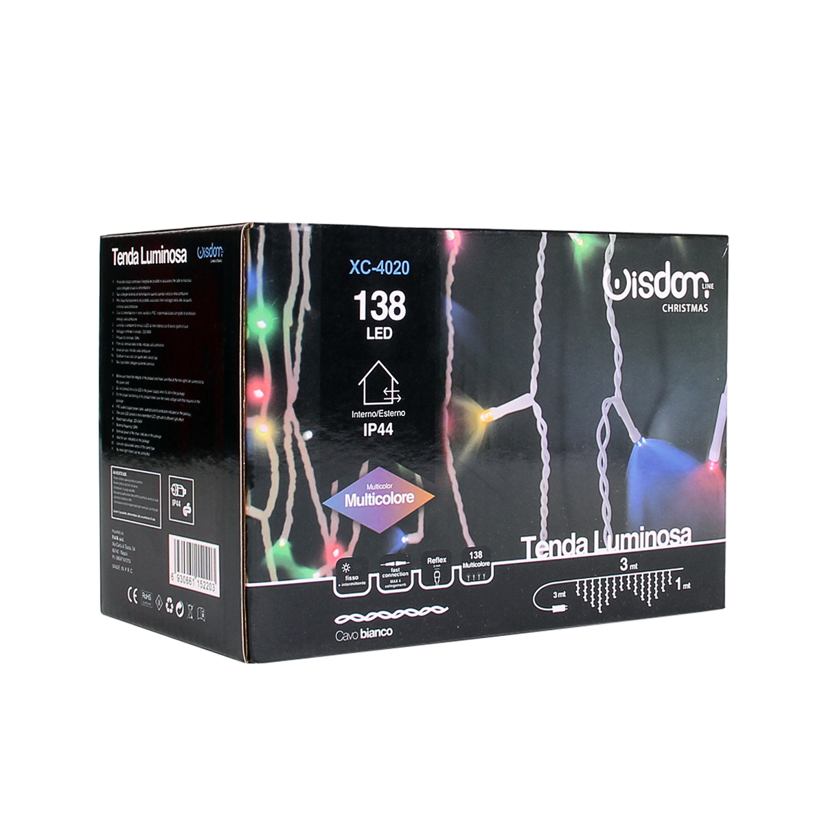 Tenda con 138 led  cavo bianco, 8 giochi di luce multicolore. Ha dimensioni di 3M di lunghezza con una altezza massima di 60cm in caduta. Ha una grado di protezione Ip44 ed è collegabile fino ad un max di 4pz ed è adatta ad un utilizzo in esterni