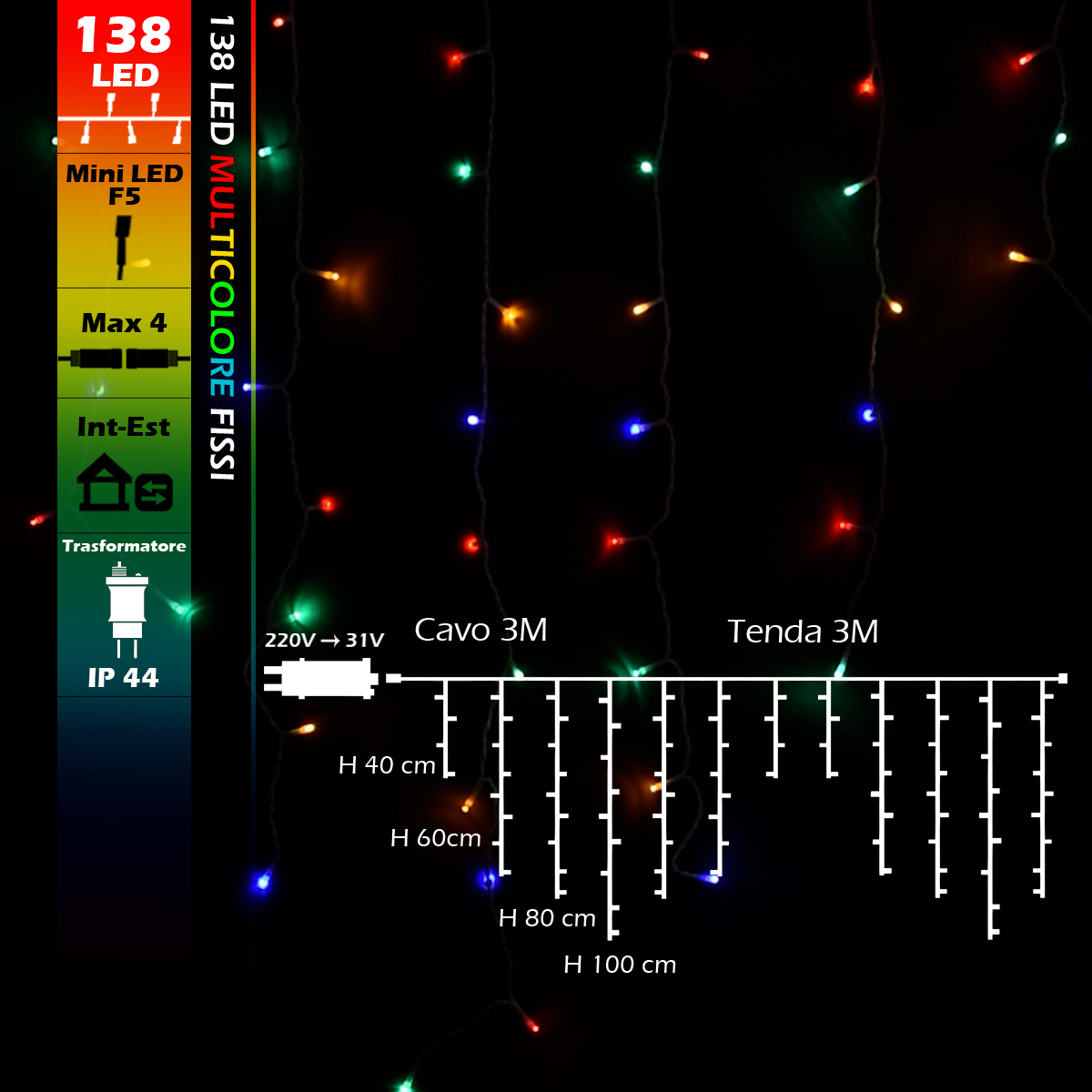 Tenda con 138 led cavo bianco, 8 giochi di luce multicolore. Ha dimensioni di 3M di lunghezza con una altezza massima di 60cm in caduta. Ha una grado di protezione Ip44 ed è collegabile fino ad un max di 4pz ed è adatta ad un utilizzo in esterni