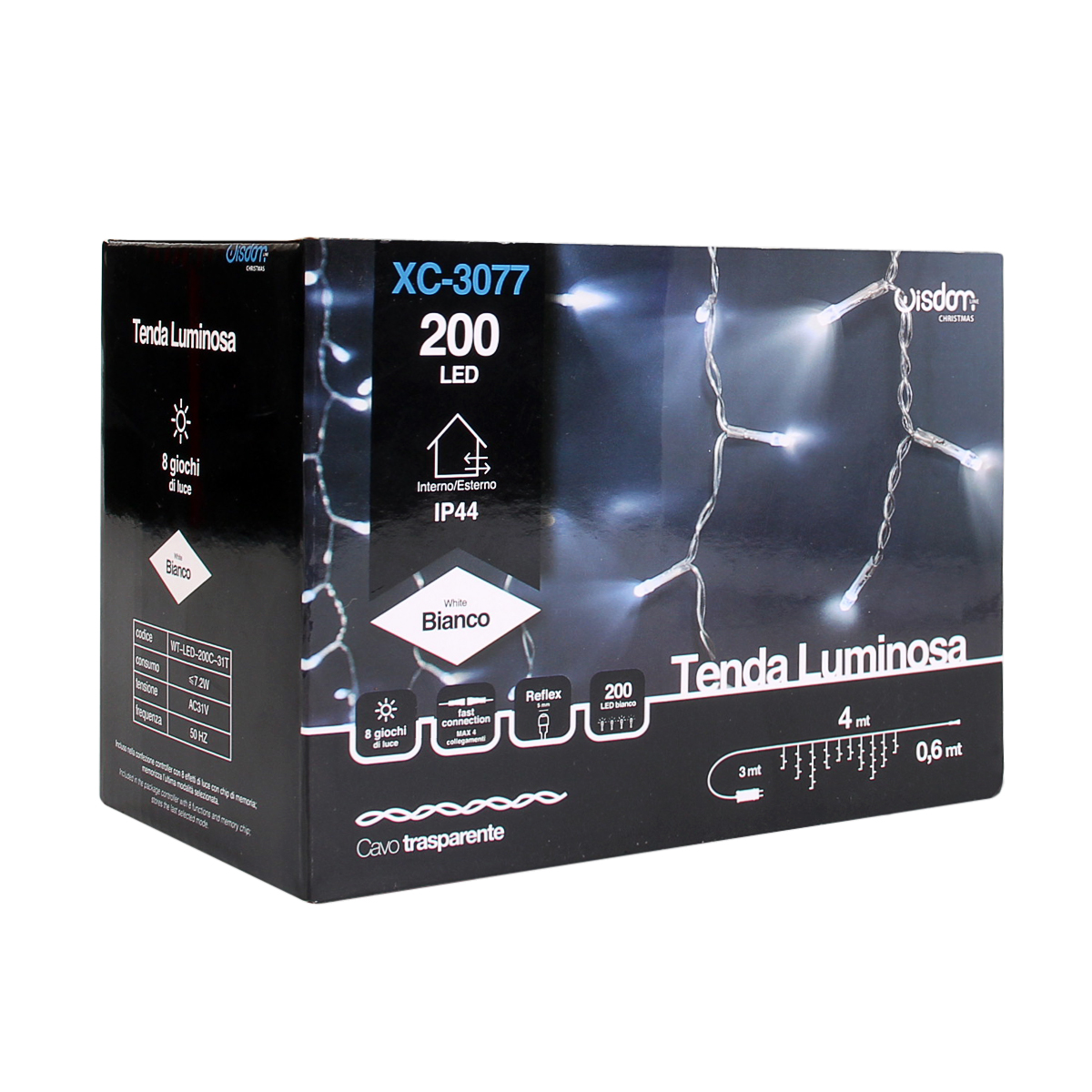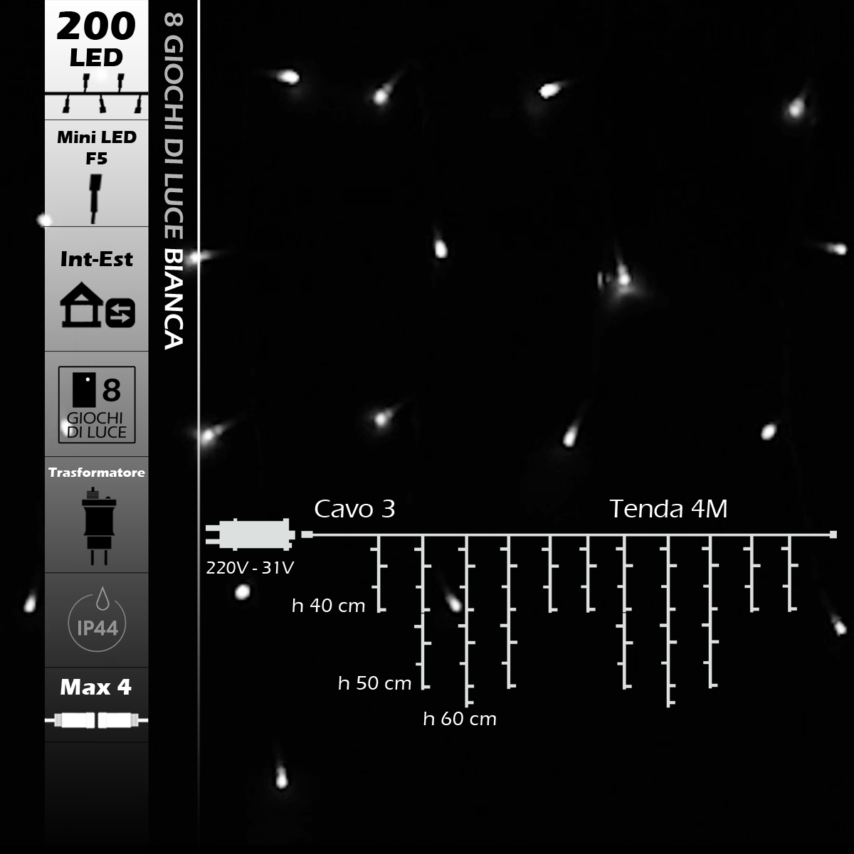 Tenda led con 300 led reflex con luce bianca, cavo trasparente ed una lunghezza di 6M con altezza max 0,7M. Alimentata a bassa tensione 31v ,risulta collegabile fino ad un max di 4 pz ed è adatta ad un utilizzo in esterni