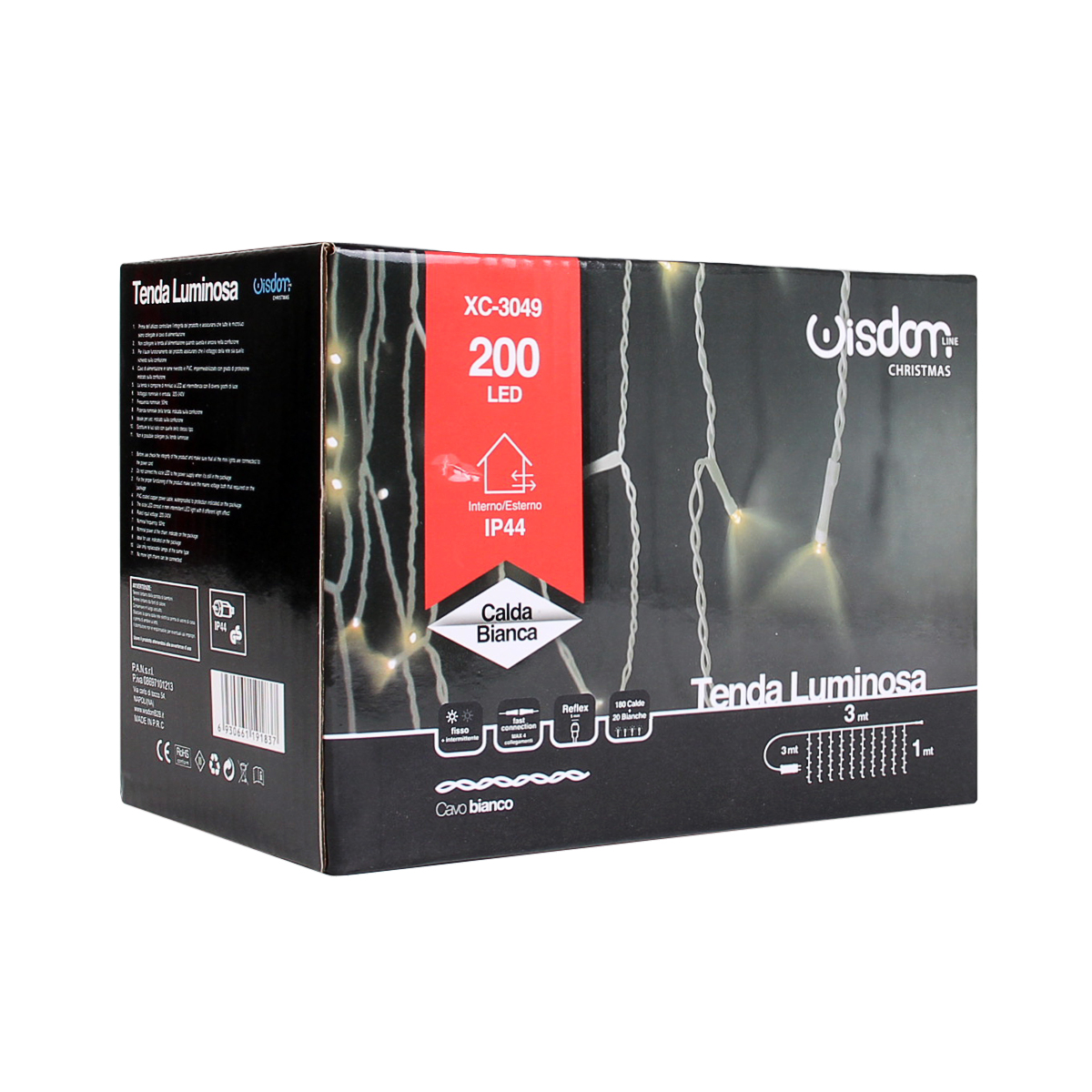 Tenda con 200 led reflex 5mm con 180 led a luce calda fissa e 20 a luce bianca intermittente. Alimentata a bassa tensione 31v è collegabile fino ad un max di 4pz ed è adatta ad un utilizzo in esterni