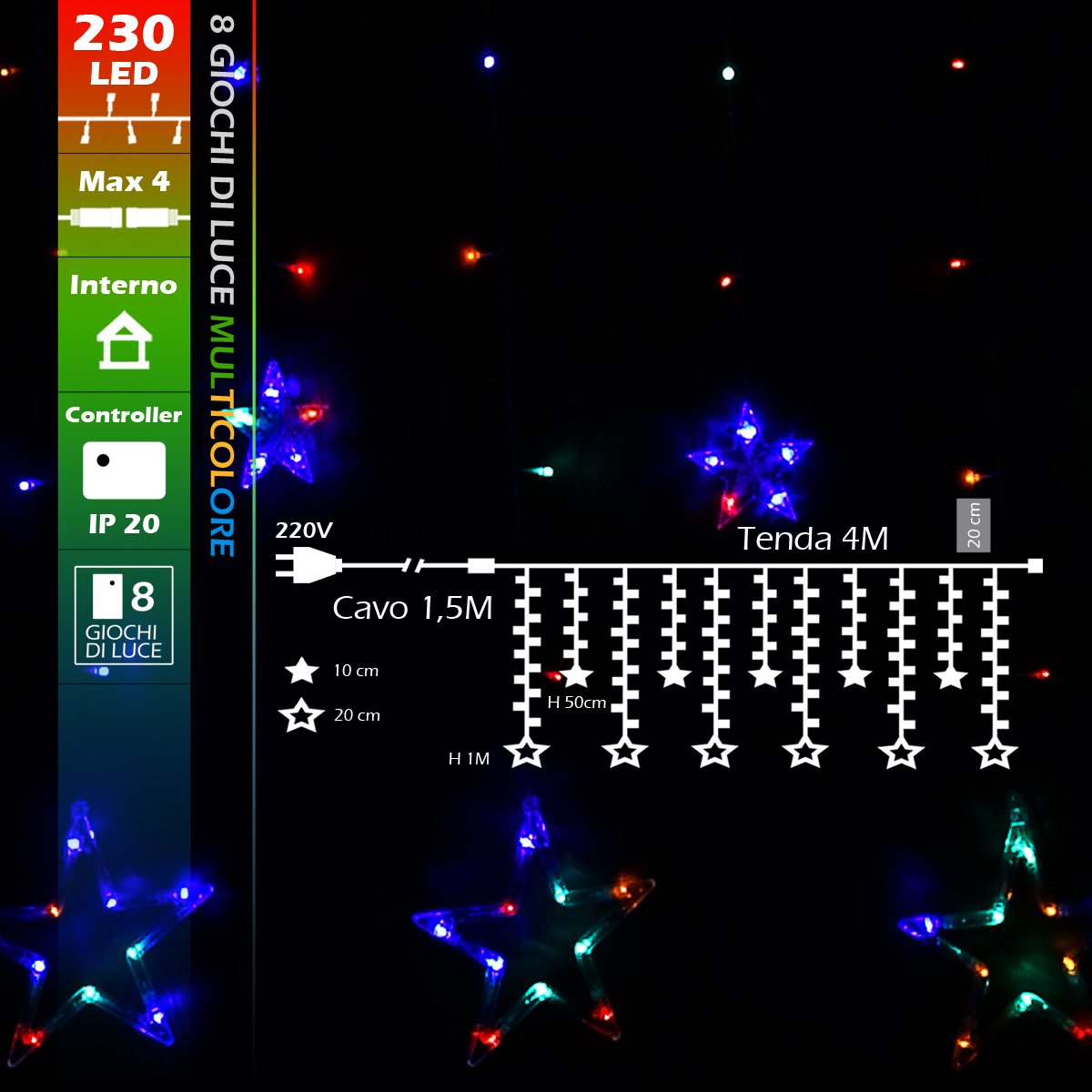 Tenda 230 led con stelle 8 giochi di luce multicolore 4M cavo trasparente con entrata in corrente diretta 220v