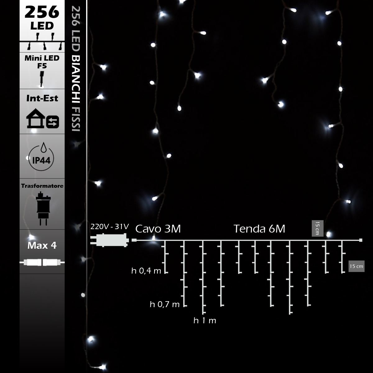 Tenda con 256 led reflex 5mm cavo bianco e luce bianca fissa. Alimentata a bassa tensione 31v è collegabile fino ad un max di 3pz ed è adatta ad un utilizzo sia in ambienti interni che esterni