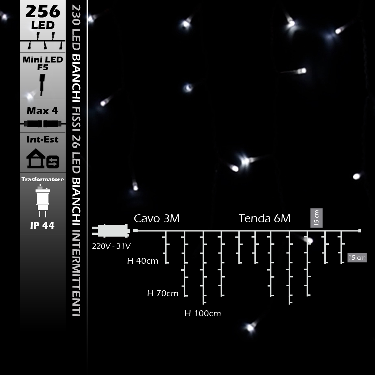 Tenda con 256 LED cavo bianco 230 led a luce bianca fissa e 26 a luce bianca intermittente Ha dimensioni di 6M di lunghezza con una altezza massima di 1M in caduta. Ha una grado di protezione Ip44 ed è pertanto adatta ad un utilizzo in esterni