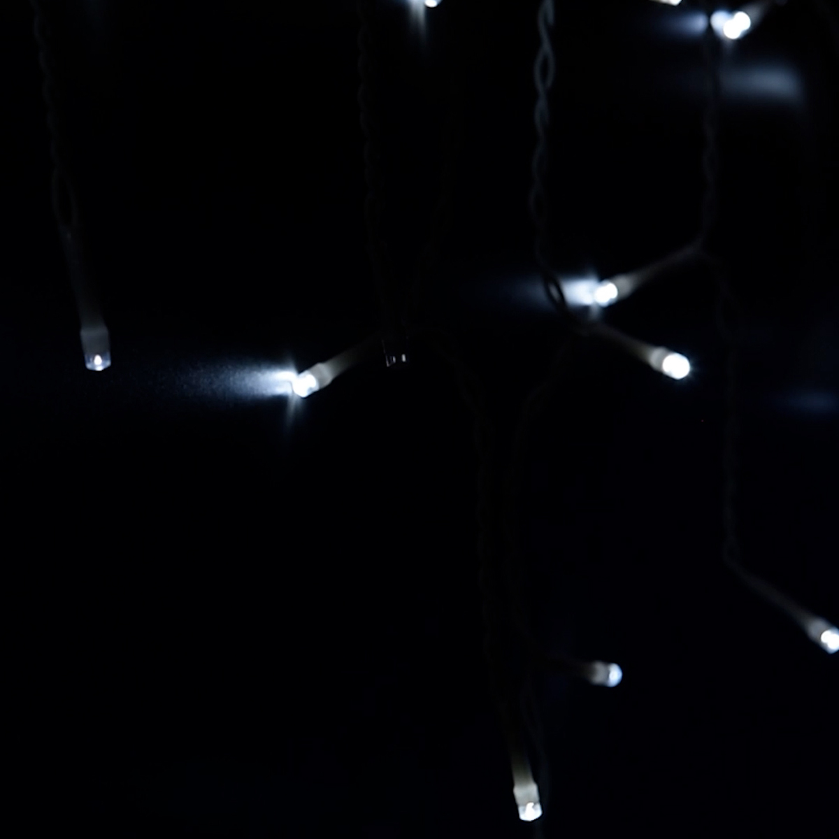 Tenda con 256 LED cavo bianco 230 led a luce bianca fissa e 26 a luce bianca intermittente Ha dimensioni di 6M di lunghezza con una altezza massima di 1M in caduta. Ha una grado di protezione Ip44 ed è pertanto adatta ad un utilizzo in esterni