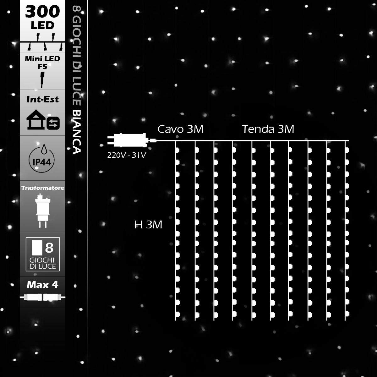 Tenda Luminosa 280 LED 220v 8 Giochi di Luce Bianca 3M Cavo Trasparente