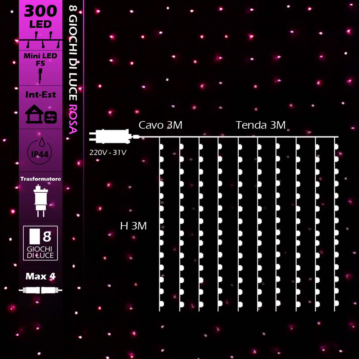 Tenda 300 micro led 8 giochi di luce Rosa 3Mx3M cavo trasparente con entrata in corrente diretta 220v
