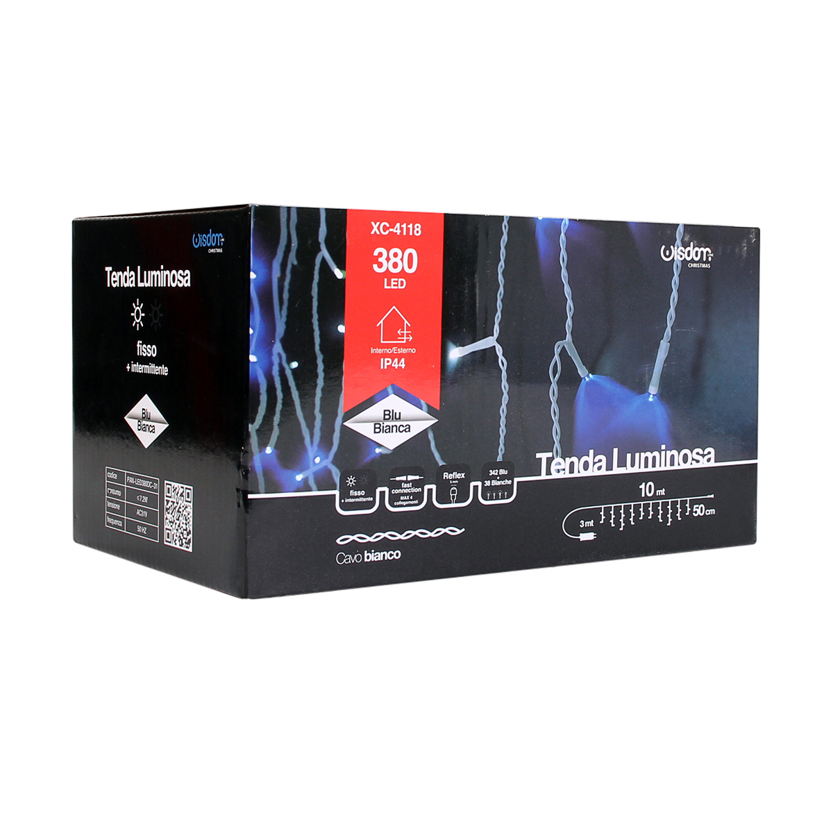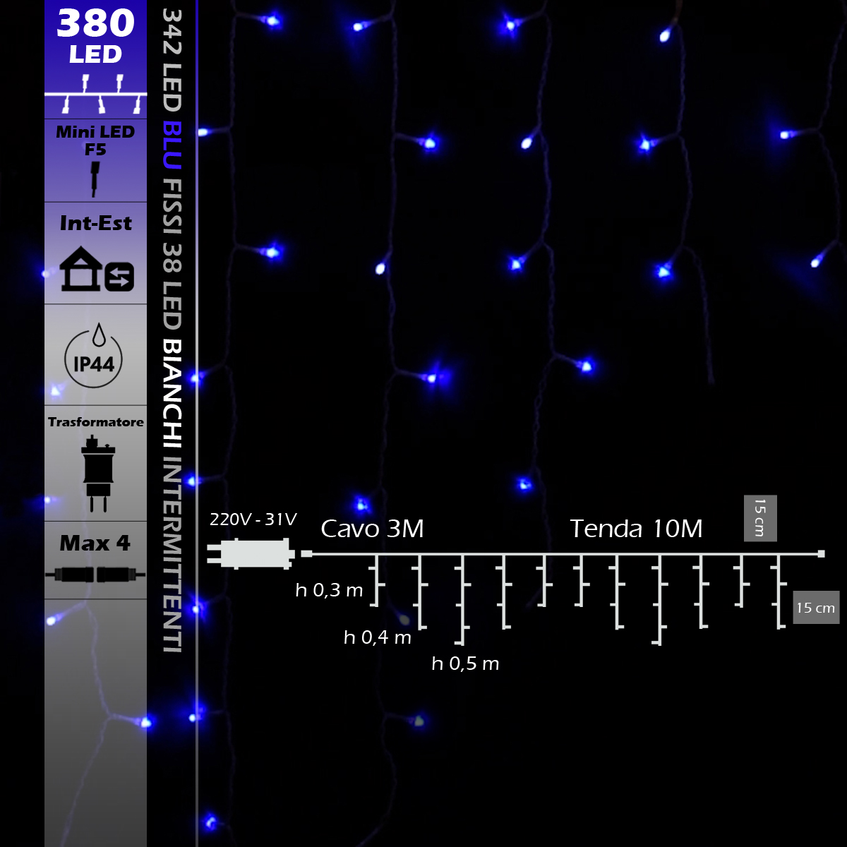 Tenda con 380 e luce blu fissa piu' bianca intermittente cavo bianco e led reflex. Alimentata a bassa tensione 31v risulta adatta ad un utilizzo in esterni