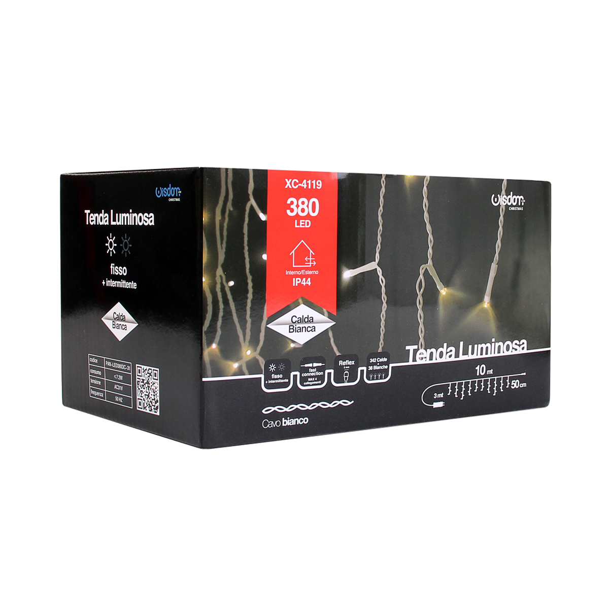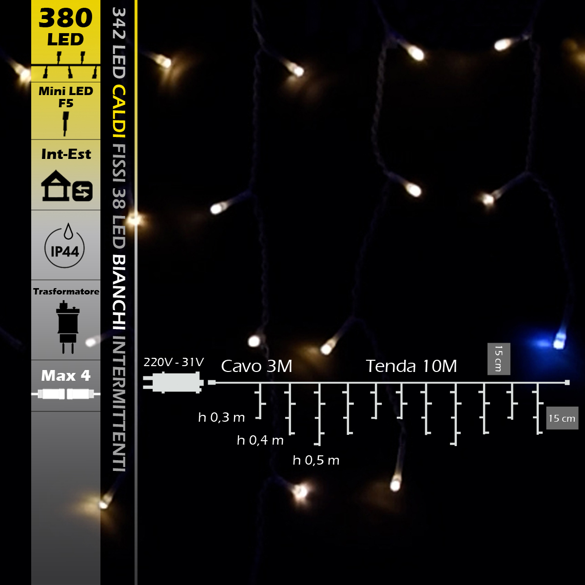 Tenda con 380 e luce calda fissa piu' bianca intermittente cavo bianco. Alimentata a bassa tensione 31v risulta adatta ad un utilizzo in esterni