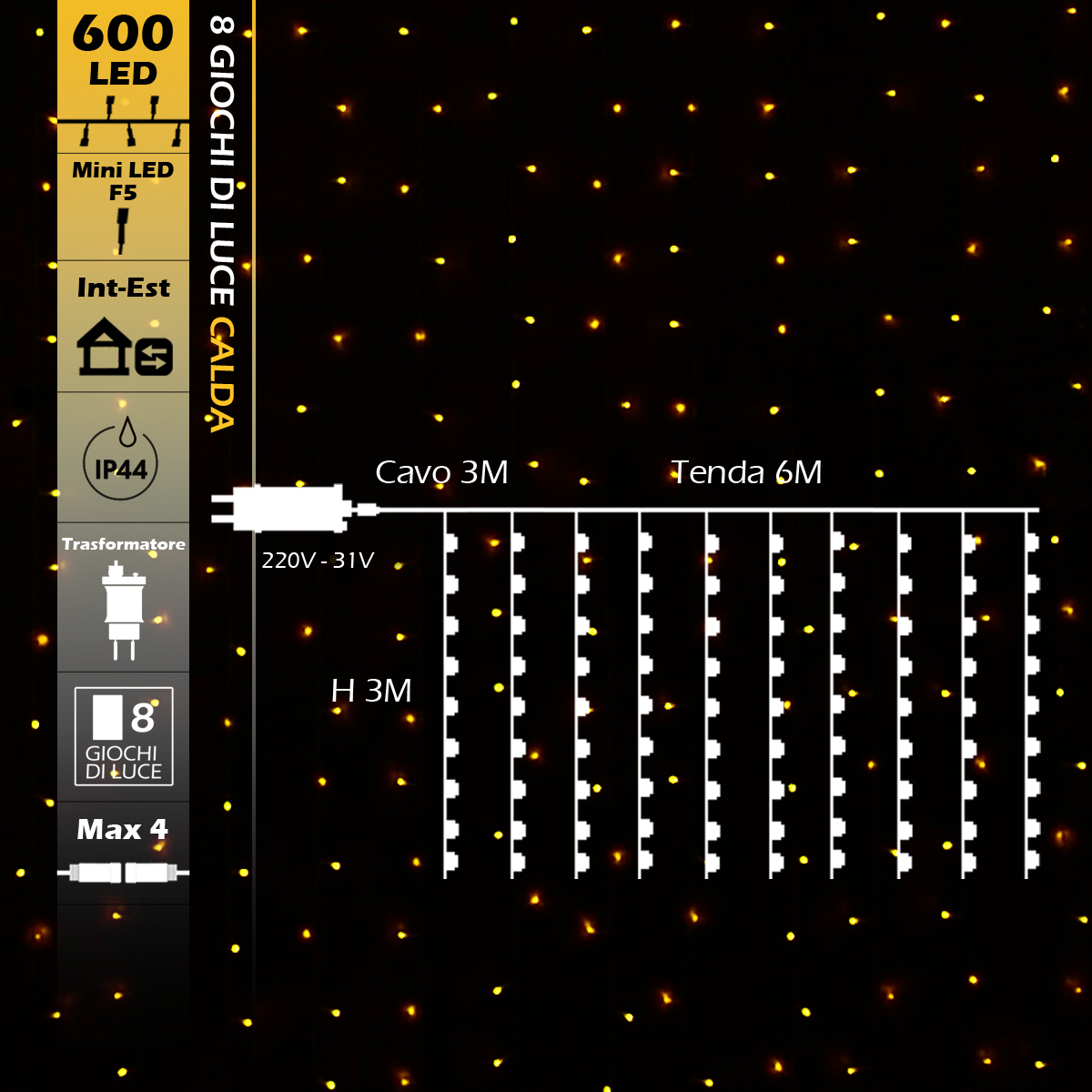 Scopri la magia e il fascino delle nostre tende luminose LED, un accessorio indispensabile per creare atmosfere incantevoli in ogni tipo di spazio, sia interno che esterno. La nostra tenda luminosa è dotata di 600 LED con luce calda che garantiscono un'illuminazione accogliente e suggestiva, perfetta per le festività o qualsiasi evento che richieda un tocco di luce e magia. Con una lunghezza di 6 metri e un'altezza di 3 metri, questa tenda luminosa è ideale per adornare pareti, finestre, facciate di edifici o qualsiasi struttura desideri illuminare. Il cavo trasparente offre un effetto visivo pulito e discreto, permettendo ai LED di brillare al massimo del loro splendore senza distrazioni. Progettata per la sicurezza e la durabilità, la tenda è alimentata a 31V a bassa tensione, con un trasformatore che garantisce un uso sicuro all'interno della tua casa o in ambienti esterni, rispettando i più alti standard di sicurezza. Il cavo di alimentazione da 3 metri offre flessibilità nell'installazione, assicurando che la spina sia facilmente accessibile. La nostra tenda luminosa non è solo un elemento decorativo ma un vero e proprio strumento di design, capace di trasformare ogni ambiente in un luogo magico e accogliente. Grazie agli 8 giochi di luce preimpostati, potrai scegliere l'effetto luminoso che più si adatta al tuo evento o alla tua serata, dallo scintillio delicato a sequenze dinamiche che catturano l'attenzione e creano un'atmosfera festiva. Realizzata con materiali di alta qualità, come gomma e rame, la nostra tenda luminosa è progettata per resistere nel tempo. Il grado di protezione IP44 assicura resistenza agli spruzzi d'acqua, rendendola perfetta per l'utilizzo esterno, senza temere le condizioni meteorologiche avverse. In termini di efficienza energetica, la tenda luminosa LED rappresenta una scelta eccellente. Grazie alla tecnologia LED di ultima generazione, offre una luminosità eccezionale con un consumo energetico ridotto, permettendoti di godere di una splendida illuminazione senza preoccuparti dell'impatto sulla bolletta elettrica. Che tu stia cercando di creare un'atmosfera magica per Natale, un matrimonio, una festa di compleanno o semplicemente desideri aggiungere un tocco di luce alla tua casa o giardino, la nostra tenda luminosa LED è la scelta perfetta. Facile da installare e ancora più semplice da ammirare, trasformerà ogni spazio in un ambiente caldo, accogliente e pieno di charme. Investi nella bellezza e nella qualità della nostra tenda luminosa LED con 600 luci calde. Scopri come un semplice tocco di luce può completamente trasformare l'atmosfera di ogni ambiente, rendendolo un luogo dove i momenti speciali vengono celebrati e ricordati