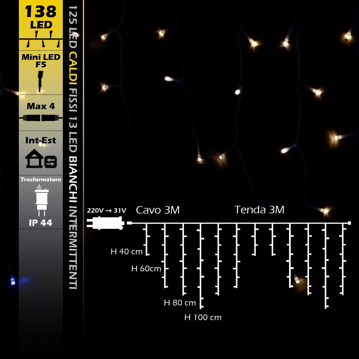 La magia e l'atmosfera che solo una tenda luminosa a LED può offrire trasformano ogni spazio, interno o esterno, in un ambiente accogliente e affascinante. Il modello che presentiamo oggi unisce eleganza e tecnologia, offrendo una soluzione di illuminazione avanzata che si adatta perfettamente a ogni contesto, dal giardino di casa fino agli allestimenti per eventi e le decorazioni natalizie. Con i suoi 138 LED dal design Reflex F5, questa tenda luminosa non è solo un elemento decorativo ma un vero e proprio strumento per creare atmosfere uniche e personalizzate. Dotata di 125 LED a luce calda fissa e 13 LED a luce bianca intermittente, questa tenda offre un mix perfetto tra calore e dinamismo, permettendo di creare giochi di luce affascinanti. La lunghezza di 3 metri e l'altezza variabile (40, 60, 80, 100 cm) la rendono versatile e adatta a coprire diverse superfici, mentre il cavo bianco da 3 metri garantisce una facile installazione e una perfetta integrazione con ogni tipo di arredamento o ambiente. Alimentata a bassa tensione (31V) per una maggiore sicurezza e un minore consumo energetico, questa tenda luminosa è progettata per l'uso esterno, grazie al suo grado di protezione IP44 che la rende resistente agli spruzzi d'acqua e agli agenti atmosferici. La possibilità di collegare fino a quattro unità insieme permette di coprire anche grandi spazi senza rinunciare alla continuità visiva e alla coerenza estetica. La scelta dei materiali, gomma e rame, non solo assicura durabilità e resistenza nel tempo ma contribuisce anche a diffondere una luce calda e avvolgente, capace di creare un'atmosfera intima e raccolta. La distanza tra i LED di 10 cm è studiata per offrire una luminosità bilanciata, evitando zone d'ombra e garantendo un effetto luminoso uniforme e piacevole. Funzionalità avanzate come la luce fissa per il 90% dei LED e intermittente per il 10% arricchiscono ulteriormente l'esperienza visiva, consentendo di variare l'atmosfera secondo le occasioni o gli eventi specifici. Questa tenda luminosa rappresenta quindi la scelta ideale per chi cerca una soluzione di illuminazione decorativa versatile, efficiente e sicura, in grado di aggiungere un tocco di magia a ogni ambiente