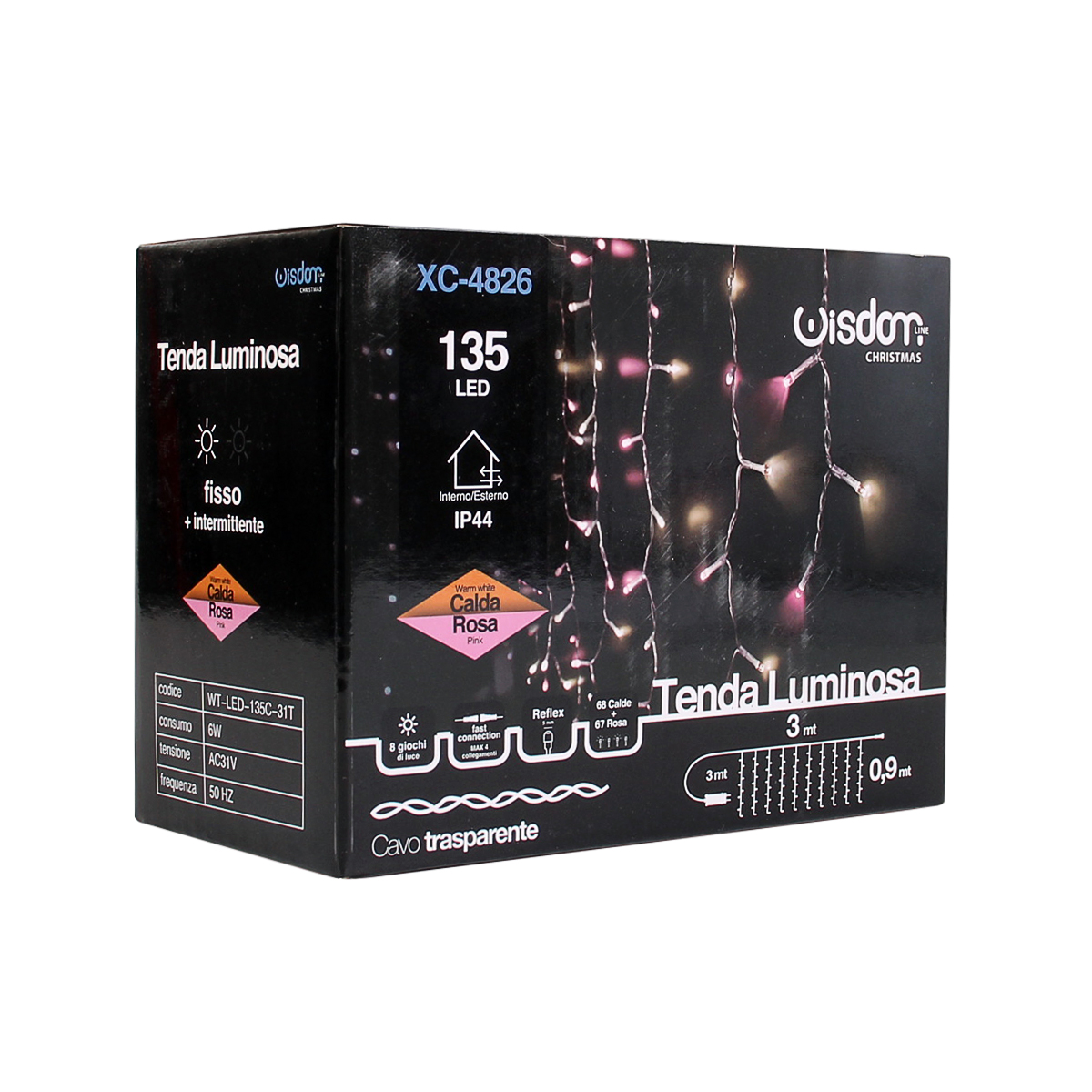 TENDA LUMINOSA DECORATIVA 135 LED GIALLI E ROSA LUCE FISSA 3M CAVO TRASPARENTE CON ALIMENTAZIONE A BASSA TENSIONE 31V