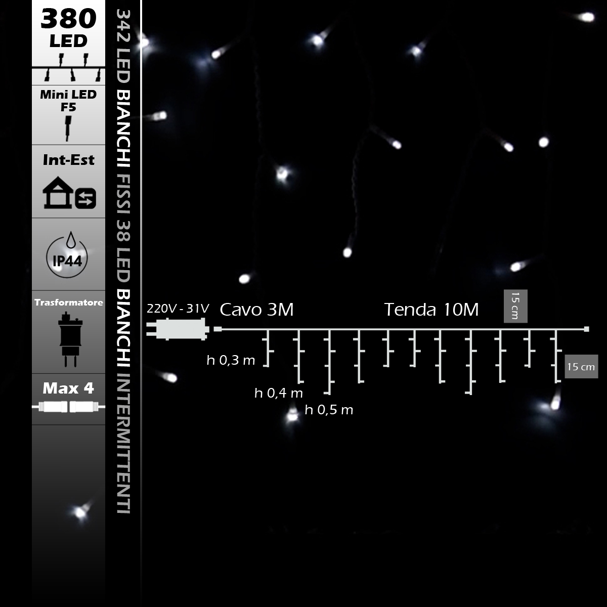 Tenda con 380 e luce bianca fissa più bianca intermittente cavo bianco led reflex 8mm. Alimentata a bassa tensione 31v risulta adatta ad un utilizzo in esterni